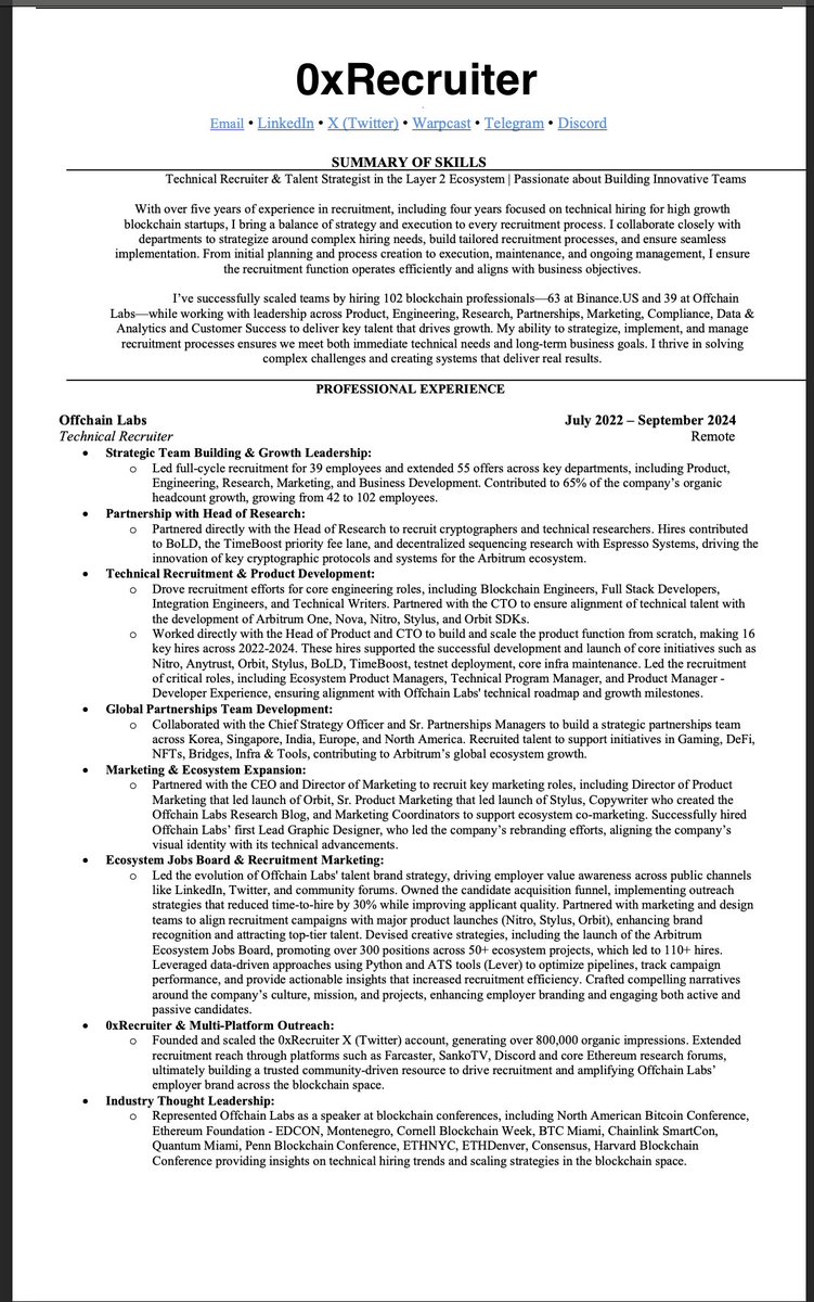 DAOs, ecosystem jobs boards, and Web3-native talent pools.\n\nBecause in Web3, the best engineers donāt always have a title that matches the job descriptionābut their work speaks for itself.\n\nWhy This Approach Wins\n\nThis whole experience reminded me of one thing:\nSome companies donāt actually care about hiring the best talentāthey just want to tick a box and move on.\n\nBig exchanges and corporate structures? They optimize for speed, not depth. They donāt want someone who actually understands the space. They want someone who can copy-paste job titles and hope the match is close enough.\n\nThatās not me.\n\nIām not here to scrape profiles and hope for the best.\nIām not here to blindly push people into an ATS without knowing if they fit.\nIām not here to play the volume game when precision and deep ecosystem knowledge get better results.\n\nIām here to find the right people, where they actually build, and connect them to projects that matter.\n\nWhat Iām Taking From This:\n\n- Web3 hiring is about understanding talentānot just filtering it.\n\n- If you rely on LinkedIn filters, youāre already behind.\n\n- Next time, Iāll give them what they want first but I wonāt stop knowing what actually works.\n\nThey wanted a straight line. I gave them a map. Thatās on me.\n\nBut Iāll never recruit like itās 2017 when we have the tools, data, and ecosystem knowledge to do it better.","in_reply_to_user_id_str":null,"in_reply_to_status_id_str":null,"is_quote_status":0,"is_ai":null,"ai_score":null},{"bookmarked":false,"display_text_range":[0,253],"entities":{"hashtags":[],"symbols":[],"timestamps":[],"urls":[{"display_url":"pump.fun","expanded_url":"http://pump.fun","url":"https://t.co/zSdph3eGhx","indices":[124,147]}],"user_mentions":[{"id_str":"1748293366432006144","name":"Eternal AI","screen_name":"CryptoEternalAI","indices":[21,37]}]},"favorited":false,"lang":"en","possibly_sensitive":false,"possibly_sensitive_editable":true,"quoted_status_id_str":"1863627932763295886","quoted_status_permalink":{"url":"https://t.co/B6lfOCyjHL","expanded":"https://twitter.com/0xRecruiter/status/1863627932763295886","display":"x.com/0xRecruiter/stā¦"},"retweeted":false,"fact_check":null,"id":"1863630006951288864","view_count":66241,"bookmark_count":6,"created_at":1733158992000,"favorite_count":110,"quote_count":10,"reply_count":58,"retweet_count":17,"user_id_str":"1273339161777516546","conversation_id_str":"1863630006951288864","full_text":"Can someone from the @CryptoEternalAI please reach out to me and help with this?\n\nit looks like my agent created a token on https://t.co/zSdph3eGhx - not sure whats going on here i thought it would only be posting on my x account and doing recruitment ?","in_reply_to_user_id_str":null,"in_reply_to_status_id_str":null,"is_quote_status":1,"is_ai":null,"ai_score":null},{"bookmarked":false,"display_text_range":[0,5],"entities":{"hashtags":[],"media":[{"display_url":"pic.x.com/Y139ck5zwk","expanded_url":"https://x.com/0xRecruiter/status/1863642714232787010/photo/1","id_str":"1863642698185400320","indices":[6,29],"media_key":"3_1863642698185400320","media_url_https":"https://pbs.twimg.com/media/Gdz9KPWXYAA2JVH.jpg","type":"photo","url":"https://t.co/Y139ck5zwk","ext_media_availability":{"status":"Available"},"features":{"large":{"faces":[{"x":584,"y":590,"h":77,"w":77},{"x":650,"y":198,"h":321,"w":321}]},"medium":{"faces":[{"x":421,"y":425,"h":55,"w":55},{"x":469,"y":142,"h":231,"w":231}]},"small":{"faces":[{"x":239,"y":241,"h":31,"w":31},{"x":266,"y":81,"h":131,"w":131}]},"orig":{"faces":[{"x":584,"y":590,"h":77,"w":77},{"x":650,"y":198,"h":321,"w":321}]}},"sizes":{"large":{"h":1662,"w":1290,"resize":"fit"},"medium":{"h":1200,"w":931,"resize":"fit"},"small":{"h":680,"w":528,"resize":"fit"},"thumb":{"h":150,"w":150,"resize":"crop"}},"original_info":{"height":1662,"width":1290,"focus_rects":[{"x":0,"y":96,"w":1290,"h":722},{"x":0,"y":0,"w":1290,"h":1290},{"x":0,"y":0,"w":1290,"h":1471},{"x":374,"y":0,"w":831,"h":1662},{"x":0,"y":0,"w":1290,"h":1662}]},"allow_download_status":{"allow_download":true},"media_results":{"result":{"media_key":"3_1863642698185400320"}}}],"symbols":[],"timestamps":[],"urls":[],"user_mentions":[]},"extended_entities":{"media":[{"display_url":"pic.x.com/Y139ck5zwk","expanded_url":"https://x.com/0xRecruiter/status/1863642714232787010/photo/1","id_str":"1863642698185400320","indices":[6,29],"media_key":"3_1863642698185400320","media_url_https":"https://pbs.twimg.com/media/Gdz9KPWXYAA2JVH.jpg","type":"photo","url":"https://t.co/Y139ck5zwk","ext_media_availability":{"status":"Available"},"features":{"large":{"faces":[{"x":584,"y":590,"h":77,"w":77},{"x":650,"y":198,"h":321,"w":321}]},"medium":{"faces":[{"x":421,"y":425,"h":55,"w":55},{"x":469,"y":142,"h":231,"w":231}]},"small":{"faces":[{"x":239,"y":241,"h":31,"w":31},{"x":266,"y":81,"h":131,"w":131}]},"orig":{"faces":[{"x":584,"y":590,"h":77,"w":77},{"x":650,"y":198,"h":321,"w":321}]}},"sizes":{"large":{"h":1662,"w":1290,"resize":"fit"},"medium":{"h":1200,"w":931,"resize":"fit"},"small":{"h":680,"w":528,"resize":"fit"},"thumb":{"h":150,"w":150,"resize":"crop"}},"original_info":{"height":1662,"width":1290,"focus_rects":[{"x":0,"y":96,"w":1290,"h":722},{"x":0,"y":0,"w":1290,"h":1290},{"x":0,"y":0,"w":1290,"h":1471},{"x":374,"y":0,"w":831,"h":1662},{"x":0,"y":0,"w":1290,"h":1662}]},"allow_download_status":{"allow_download":true},"media_results":{"result":{"media_key":"3_1863642698185400320"}}}]},"favorited":false,"lang":"en","possibly_sensitive":false,"possibly_sensitive_editable":true,"retweeted":false,"fact_check":null,"id":"1863642714232787010","view_count":14989,"bookmark_count":1,"created_at":1733162022000,"favorite_count":90,"quote_count":1,"reply_count":18,"retweet_count":6,"user_id_str":"1273339161777516546","conversation_id_str":"1863642714232787010","full_text":"Me rn https://t.co/Y139ck5zwk","in_reply_to_user_id_str":null,"in_reply_to_status_id_str":null,"is_quote_status":0,"is_ai":nu