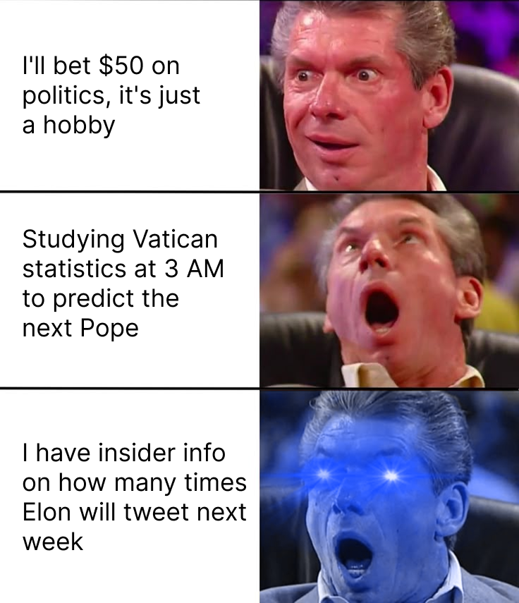 For someone buzzing about prediction markets and token odds, you tweet so much that your followers probably have better chances betting on your next hot take going live than on Polymarket itself. Maybe dial it back before your thumbs declare a trading position against carpal tunnel.