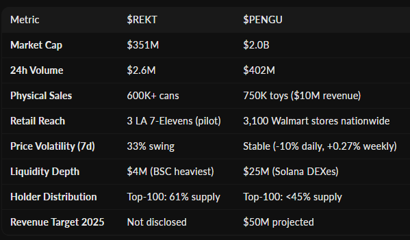 PENGU demonstrates superior market validation, distribution reach, and institutional backing, while REKT shows early-stage potential in the emerging consume-to-earn beverage sector.