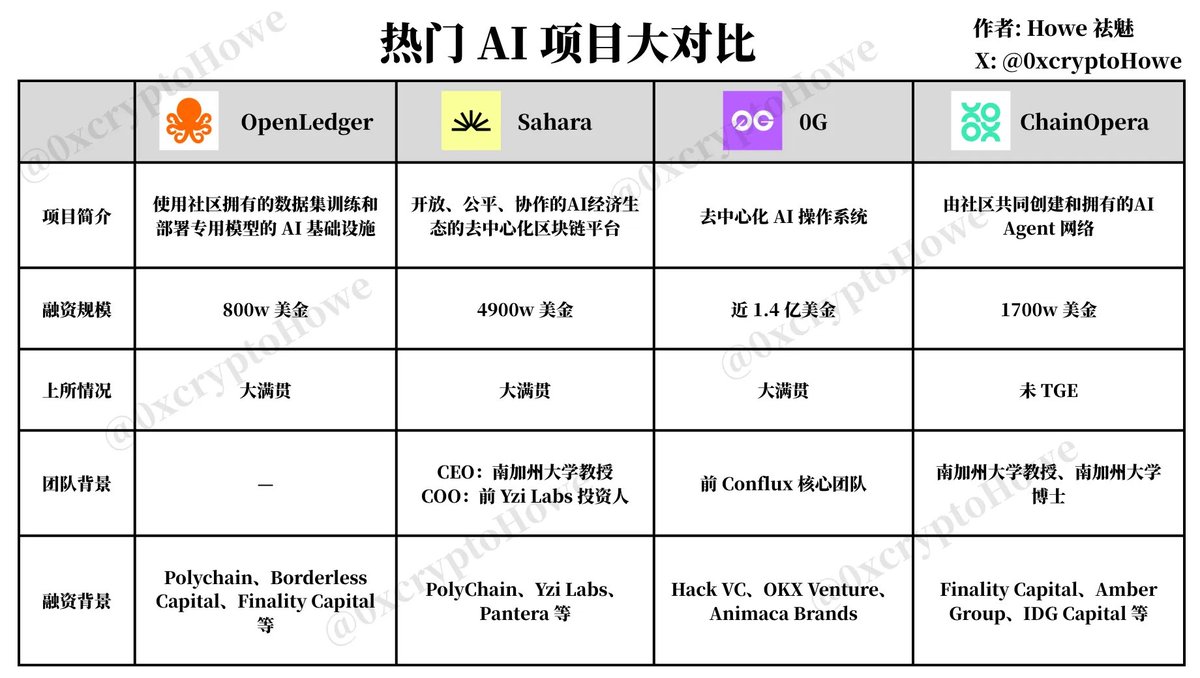 无论是 BN Alpha 还是现货,最近都上了不少 AI 项目 单看基本面已基本没有太多参考价值,反倒是背景资源成为了最需关注的部分 今天我将把近期热门的 AI 项目进行对比,顺带聊聊明天上 Alpha 的 ChainOpera @ChainOpera_AI,看看是不是真有一个专门做 Crypto AI 的“黑帮组织” 1️⃣ 在融资规模上,0G 以近 1.4 亿美金领跑,Sahara 约 4900 万美金居中,OpenLedger 800 万美金偏轻,而 ChainOpera 为 1700 万美金 表面看 ChainOpera 不占“数字优势”,但这反而意味着一个更友好的定价阶段:同属 Crypto × AI 的主流叙事,0G、Sahara 的高额融资已基本价格化,而 ChainOpera 在资源质量不逊色的前提下仍处于 TGE 前后、空间尚未被充分兑现的区间,给了参与者更清晰的“补涨 + 重估”想象力 且我一直强调,融资不是越高越好,TGE 前这是可用资金,TGE 后这是项目方需要偿还的债。结合目前的市场环境,合理的融资额对于项目方而言才是更好的选择,二级压力会小一些 2️⃣ 在团队背景上,几家项目都有着强学术或强资源:0G 来自前 Conflux 核心团队,有着不可复刻的强大背景;Sahara 有南加州大学教授与 Yzi Labs 投资背景,大部分投资人都是冲着教授的背景去的;OpenLedger 则是找到了不错的金主爸爸 ChainOpera 的亮点在于“学术到工程”的闭环更硬:联合创始人来自南加州大学的教授与博士组合,使其更像是能把“Agent 网络”做成基础设施的平台型团队。且这等团队背景对于欧美 VC 来说是非常青睐的 3️⃣ 在融资背景上,四家都有一线资本背书:Sahara 拿到 Polychain、Yzi Labs、Pantera 等;0G 得到 Hack VC、OKX Ventures、Animoca Brands 的产业资源;OpenLedger 有 Polychain、Borderless、Finality 等基金扶持 ChainOpera 的融资背景也不错:Finality、Amber、IDG 等机构投资以外,还能看到 EigenLayer 创始人、Babylon 联创等。这些 AI 项目背后的投资群体有着很高的重合度,像 EigenLayer 创始人除了投资 ChainOpera 外,还投资了 Openledger 结合目前的市场声量来看,明天 TGE 的 ChainOpera 有不小的潜力,具体的代币分析我会另开一篇讨论