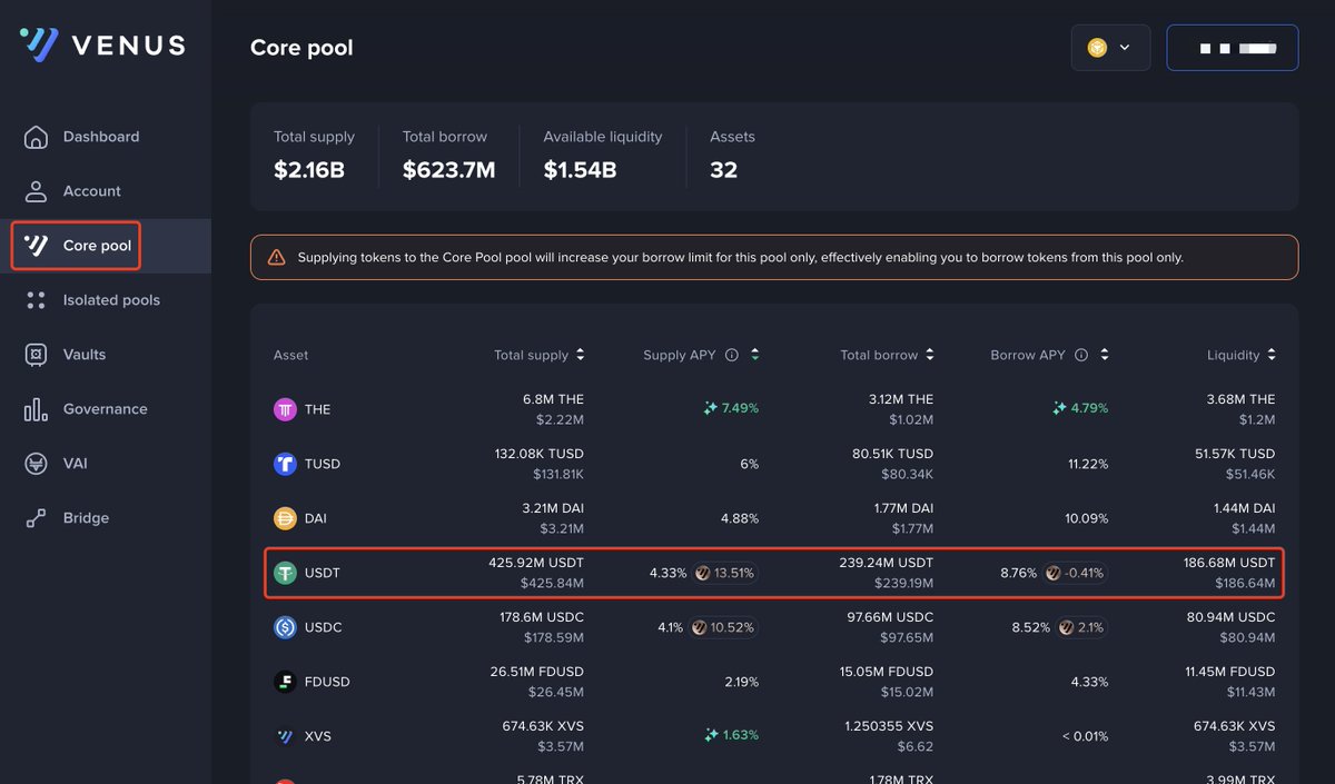 『链上“免费”借贷参与 BN Wallet 活动教程』 最近 Binance Wallet 一直积极为大家谋福利,据说之后还有好几个类似的 TGE 活动 那么找到最具性价比的参与方式就非常有必要了,因此今天给大家带来链上无利息借贷的参与方式,后续参与均可使用 声明:本教程仅供交流使用,无任何投资建议 ———— 1️⃣ 为什么说是“免费”借贷 ➣ 链上协议的借贷利率不会在短时间内有较大波动,如本教程使用的 @VenusProtocol BNB 借贷利率为 3.43% ➣ CEX 的借贷利率由于短时间内的参与人数暴增,普遍会升至两位数的借贷利率 而参与活动的时间仅有几个小时,对比下来通过链上协议借贷参与的费用只用几笔小额 gas 费 + 极低的借贷费用,约等于不要钱(“免费”) 2️⃣ 为什么要通过借贷参与活动 ➣ 一般这类活动消息会吸引大量用户参与,而此类活动只收取 BNB,但不是所有人都持有 BNB,短时间就会有大量的买单 ➣ 在活动结束后,原先购买的 BNB 会有很大一部分变为抛压,因此如果没有在结束后及时将 BNB 售出,可能会蒙受 BNB 的价差亏损 而借贷则可以避免这一潜在的价差亏损 ———— 注:本教程均在 BSC 链上进行 1. 首先我们需要在 BSC 准备足够的资金,这里建议准备 USDT 活动限制每个账户硬顶 3 BNB,那么想要完全借出 3 BNB 的话至少需要准备价值 3.75 BNB 的 USDT,但最好多准备一些如 4 BNB 等值 USDT 以免被强制清算 2. 进入 @VenusProtocol 点击左侧“Core pool”界面并点击 USDT Pool 3. 进去之后直接在右侧“Supply”界面中质押 USDT,质押完成后记得开启“Collateral”选项,否则将无法进行 BNB 借贷 若在 Supply 后没有看到“Collateral”选项,可在左侧 Account 界面找到相应池子开启 4. 回到“Core pool”界面找到 BNB 池子并点击右侧“Borrow”界面进行借贷,注意合适的借贷比例以免触发强制清算 5. 将借贷得到的 BNB 发送至 Binance Wallet 钱包,质押参与活动即可 6. 活动结束后,将对应数量的 BNB 发送回质押借贷的钱包中。然后回到 @VenusProtocol BNB 池右侧“Repay”界面还款,再到 USDT 池右侧“Withdraw”界面将质押的 USDT 提出即可 「推文限制,这里就不放图了」 ———— 补充一下,鉴于之前的表现。在拿到相关代币后如果没办法直接在 Binance Wallet 卖出的话建议直接打到 UniversalX @UseUniversalX 或者 OKX Wallet @wallet 卖出 如果链上资金需要跨链的话,可以通过 1. UniversalX:接收 -> 闪兑 -> 发送,顺手刷点交易量 2. OKX Wallet:兑换功能 3. Defi App @DefiApp_CN:deposit -> trade -> withdraw,顺手刷点交易量