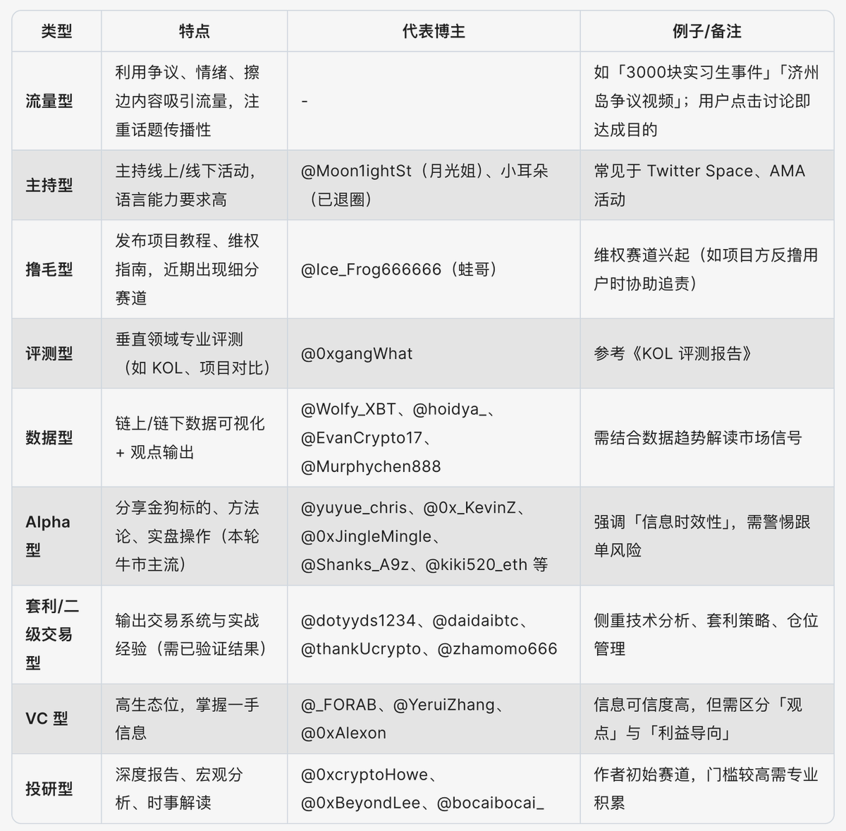 『价值百万的 KOL 干货秘籍!』 前两天在外面忙,没想到大家都开始讨论怎么做 KOL 了。但发现没什么人聊这个市场到底有哪些 KOL 的路径和方向,这里也借着教主的推说说我知道的,以便大家找准自己想做的方向 这些也都是我与一些 KOL 交流过后得出的,话不多说,直接上干货 1️⃣ KOL 方向大盘点 我见过很多人说想做 KOL,但却不知道做什么类型。因此先罗列我知道的一些方向 ➣ 流量型:经典的传统互联网流量打法,这类博主主打一个各种挑动大家情绪,有争议有流量的事情是他们的最爱,比如八卦、对喷、引战、擦边、故事整理等等。具体如某 3000 块实习生、济州岛视频等,如果你因此点开查看甚至参与讨论,那么就正中下怀 ➣ 主持型:主要以女生为主,工作内容以主持各类 Twitter Space,线下 AMA 等等,会越多的语言上限越高。具体可参考月光姐 @Moon1ightSt 、小耳朵(退圈了) ➣ 撸毛型:发表各类项目投研报告和相关交互教程,不过最近还出现了以蛙哥 @Ice_Frog666666 为首的撸毛维权赛道 ➣ 评测型:针对某一赛道/方向进行评测,比如 @0xgangWhat 做过的 KOL 评测 ➣ 数据型:整理一些相关链上链下数据并可视化,同时根据这些数据写写自己的观点。做得比较好的可参考 @Wolfy_XBT @hoidya_ @EvanCrypto17 @Murphychen888 ➣ Alpha 型:这类博主是这轮出现最多的,主要分享各类金狗标的、自身方法论、优质项目以及实盘操作等。具体可参考 @yuyue_chris @0x_KevinZ @0xJingleMingle @Shanks_A9z @kiki520_eth @xxk_hl @CryptoCharming1 ➣ 套利/二级交易型:输出交易思路和观点为主,可以理解为他们自身已形成了自己的一套交易系统并以此拿到结果。具体可参考 @dotyyds1234 @daidaibtc @thankUcrypto @zhamomo666 ➣ VC 型:这类博主自身生态位较高,获得的信息量会比普通用户多且可信度更高,因此他们的观点和一些信息是值得看的。具体可参考 @_FORAB @YeruiZhang @0xAlexon @Wuhuoqiu ➣ 投研型:输出各类各类研究报告,对时事的解读等等,宏观分析跟投研基本类似。这是我自己最开始做的赛道,相关可参考 @0xcryptoHowe @0xBeyondLee @bocaibocai_ 当然还有一些非常独特的小众赛道,比如玄学型。鉴于参考意义不大,就不罗列了 注:表格是使用 Deepseek 协助生成,可能存在错误 2️⃣ 不同赛道 KOL 现状 不同类型的 KOL 其上限和潜力是完全不同的,并且有些类型无惧牛熊,有些类型则等待时机才能爆发 ➣ 无惧牛熊类(流量型、主持型、数据型、套利/二级交易型、VC 型) 这一品类的博主基本都是有比较独特的优势或能力,不太受制于市场环境的影响 流量型的只要能够有声量即可,400u 天团的实力无需解释 主持型的属于只要行业没完蛋就一直能有活干的状态,并且这一方向市面上能做的并不多,所以只要实力过关是不太需要没有合作的 数据型的属于散户爱看型,但这条路的变现能力个人认为较差,我能想到的只有给项目方提供数据、借此找到一些数据分析岗位、辅助自己投资赚钱三种方式 套利/二级交易型的就是纯靠自己硬实力吃饭了,核心是有自己的交易系统,并且能够适应市场的变化 VC 型的由于生态位的巨大优势,可能流量增长并不多,但是赚钱的方式有很多种,并且会出来做账号本质是带有一些目的的 ➣ 等风来类(撸毛型、评测型、Alpha 型、投研型) 撸毛型很看市场行情,在上一轮撸毛路线基本是捡钱行情,但很明显这一轮由于泡沫的出清导致并没有太多很好的机会,甚至搞得博主们经常得去维权 评测型需要在市场行情较好的时候流量才会不错,尤其根据当时的市场热点进行评测。但相关变现路径比较少,应该基本都是靠接一些合作推广为主 Alpha 型同样得在市场行情好的时候才能做起来,毕竟是最具有财富效应的方向,一直得是流动性不错的时候才能有 Alpha。这个方向上限非常高,再具体的我就不方便说了 投研型的堪称本轮最难博主,现阶段写研报的效果已经大不如前,并且因为其他一些搅屎棍,导致大家很难分辨清好坏,大大挤压了投研博主的生存空间。使得很多高质量博主们纷纷开始转型,比如抽象+投研,结构+投研,Alpha+投研等等 注:表格是使用 Deepseek 协助生成,可能存在错误 ———— 如果你是看到标题并点进来看到这里,说明我的流量打法已经达到了目的 关于具体的 KOL 做法已经有很多文章了,如果你自己还有相关疑问的话也欢迎 DM 我交流 最近我准备开个自己的社区交流群,纯免费,想加入的评论私信即可🫡 有些公网不太好说的会在社区群里说🤣
