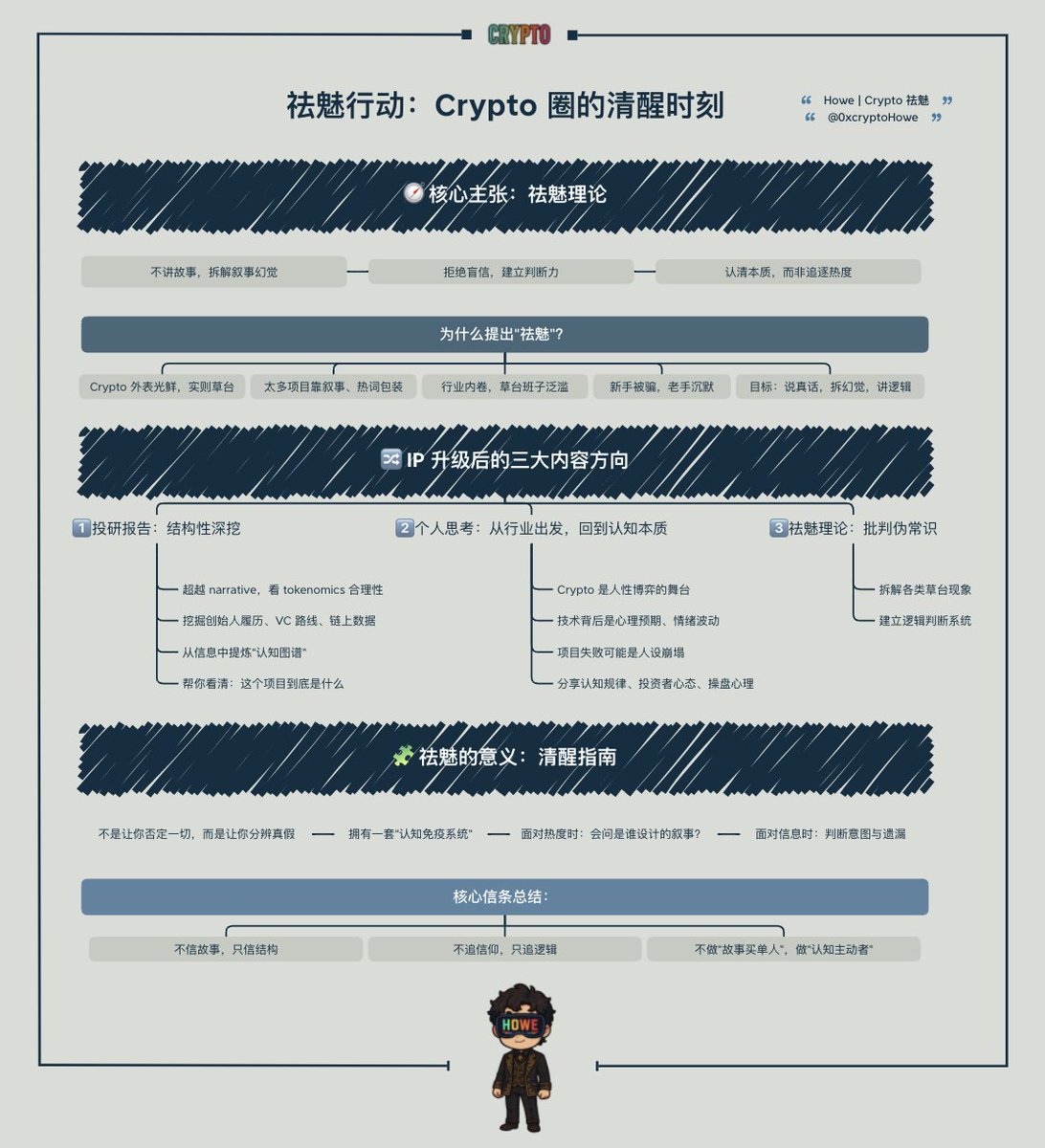 『祛魅行动:Crypto 圈的清醒时刻由我开启』 Crypto 圈里,故事永远比真相好听。Web3 要“重塑一切”,项目自称“革命”,社区号称“未来” —— 每句都像史诗,但牛熊一换,老话应验:“听故事的,永远在买单” 我,不讲故事。我拆故事。这是我个人 IP 的升级起点,也是我的主张:#祛魅理论 ➣ 为什么“祛魅”?因为真相比包装值钱 Crypto 表面光鲜,底层粗糙。太多项目用叙事掩盖平庸,用热词包装空洞。你追的“创新”,可能是旧模复刻。你眼中的“大神”,可能是背后包装好的门面 这圈子快成草台班子的秀场了,包装得太好,新手看不穿,老手忙着赶场没空拆。我写过代码,追过 deal,见过太多“故事大王”。现在,我想帮你省点学费,做件不讨好的事:说真话,拆幻觉,讲逻辑 ➣ IP 升级,三大方向带你看清 Crypto 1️⃣ 投研报告:不止于表象,更深入结构 别人看 narrative 热不热,我关心的是机制是不是埋了雷。别人听谁站台,我去查背后资金流和地址标签 我做的不是“总结资料”,而是一场结构性解剖。从链上数据到治理逻辑,从代币分发到社交网络,层层拆解,把项目还原成它最真实的样子 我不会替你做决定,但我会确保你是在看清之后再做决定 看不懂数据?不确定该怎么查?私信我 —— 项目怎么吹不重要,真相我们一起挖 2️⃣ 个人思考:从行业出发,回到认知本质 Crypto 是我所在的行业,但不是我思考的边界 很多项目在崩塌的表象下,其实折射的是人性的共性——贪婪、恐惧、从众、懒惰。你以为只发生在 Web3?其实换到任何行业,换一套叙事,底层机制都一样 我更关心的是规律,而不是噪音;是人的运行机制,而不是行业的短期热度 这些思考不是为了显得“高”,而是为了让我自己不断认清一个事实:认知,是唯一可以跨行业迁移的资产 每一次深挖本质的过程,都是一次自我升级。我分享这些,是希望你也能从看项目、追赛道的惯性中跳出来,去发现背后真正通用的逻辑 认知变现,始于洞察本质 3️⃣ 祛魅理论:从看穿表象,到建立判断力 在这个行业,最稀缺的不是信息,而是辨识力。白皮书是 AI 写的,代币模型是复制粘贴的,连融资新闻都是成套包装的。你看到的很多“事实”,只是别人希望你相信的叙事 祛魅,不是为了唱反调,也不是为了反对谁,而是为了看见事情真实的样子 我所说的“祛魅”,是系统性地去识别那些看似合理、实则空洞的叙事;去打破行业惯性灌输给我们的伪常识;去训练我们对模糊地带的直觉和判断 信息时代最大的陷阱,不是你没看到东西,而是你看到太多“错的东西”,并误以为那就是全部 祛魅理论,就是一套让你建立清晰认知边界的方式。它让你在下一次看到一份融资公告,或是一场热度暴涨的 AMA,或是一位声称“参与早期项目孵化”的 KOL,不会马上动心,也不会直接嗤之以鼻。你会开始问:这个局是谁设计的?它希望我信什么?它遗漏了什么? 祛魅不是冷眼看世界,而是有能力选择相信什么。它不是为了让你“什么都不信”,而是让你“只相信经得起验证的”。真正的独立思考,不是消极怀疑,而是有根有据的过滤系统 我会在这个板块,持续输出这样的内容:行业现象背后的话术逻辑、认知盲点、结构性偏差。不是教你“不被骗”,而是让你拥有“不会再被骗”的系统能力 ➣ 祛魅,是你的 Crypto 清醒指南 祛魅不是让你退出 Crypto,而是让你玩得更聪明,赚得更踏实。我不想你怀疑所有人,我希望你用逻辑分辨谁值得信任。我不想打碎你的梦,我只想让你分清幻觉和真实 我是 Howe,拒绝忽悠,只给认知。在这个故事满天飞、骗局换皮的时代,让我们一起保持清醒,在祛魅中前行 当然,祛魅不是我一个人的战斗。你遇到过哪些 Crypto “伪常识”? 欢迎评论区或私信分享,加入 #祛魅理论,和我一起拆故事、建认知! 如果你看到这里,说明你是圈里少数还在用脑子的人。关注、留言、转发,祛魅路上,我们不孤单 最近我也开了自己的频道和社群,欢迎大家加入 频道:t.me/cryptohowe_tre… 社群:t.me/cyrptohowe_dis…