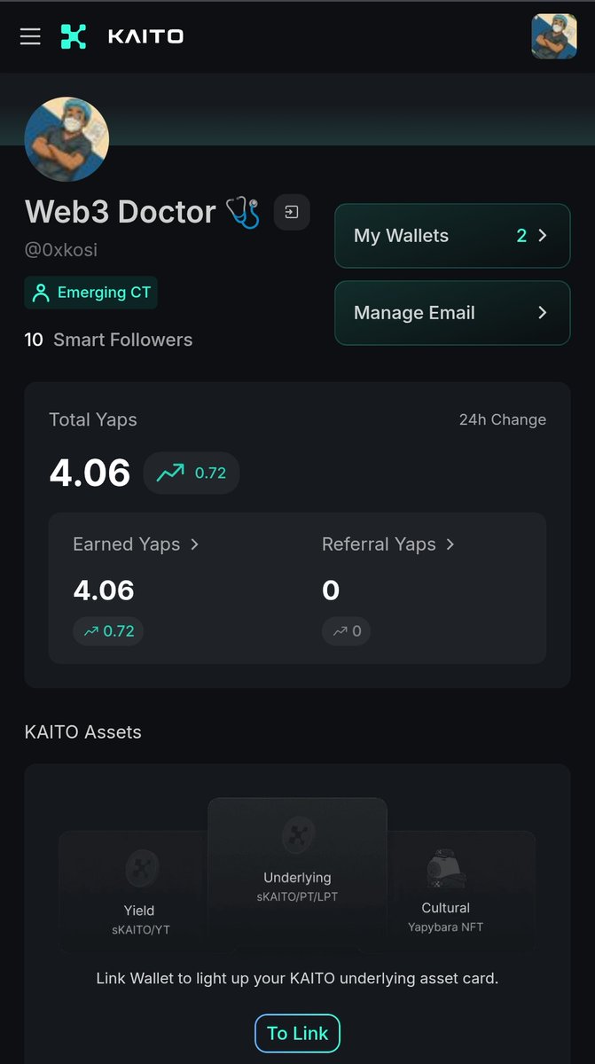 Web3 Doctor 🩺 is a relentless blockchain hustler, blending day-to-day trades with lofty crypto dreams by night. With an impressive tweet count and a solid focus on engaging the Web3 community, they live and breathe all things on-chain. Always on the hunt for opportunities, they thrive in the chaotic, fast-paced world of decentralized finance and digital assets.