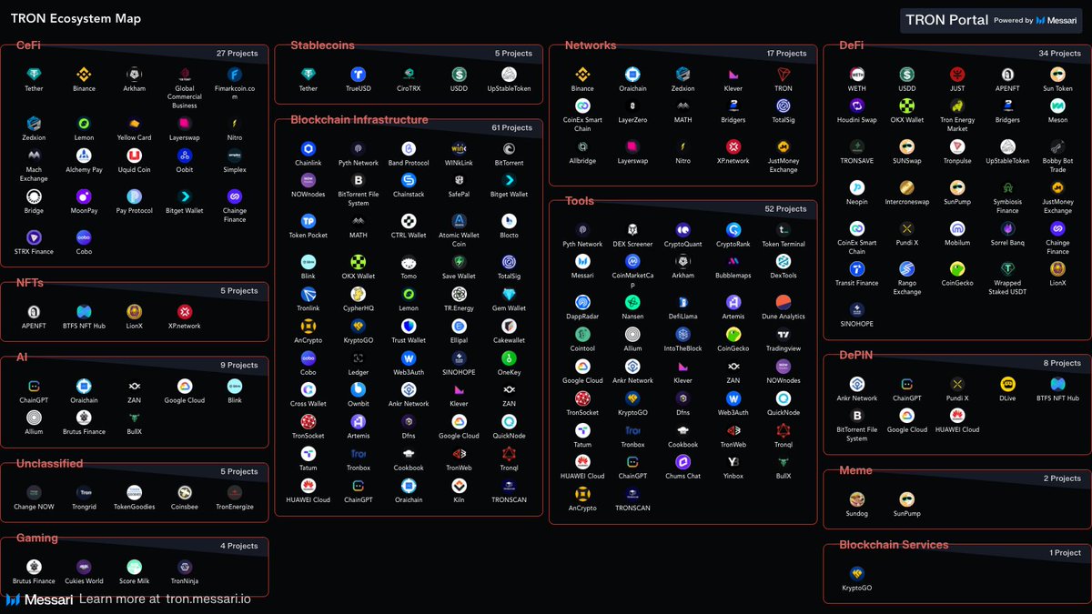 TRON Let the numbers do the talking. Just scrolled through the TRON Ecosystem Map and had to zoom out twice to fit all the projects. → 61 Blockchain Infrastructure projects → 52 Tools → 34 DeFi plays → 27 CeFi integrations → 9 AI projects (because why not?) → Even Gaming and DePIN etc At this point, the only thing missing is a TRON-themed coffee shop and dating app. And with this kind of momentum, don’t be surprised if $TRX starts getting listed on Mars next. This is an Ecosystem Overdrive. #TRONEcostar @trondao @justinsuntron