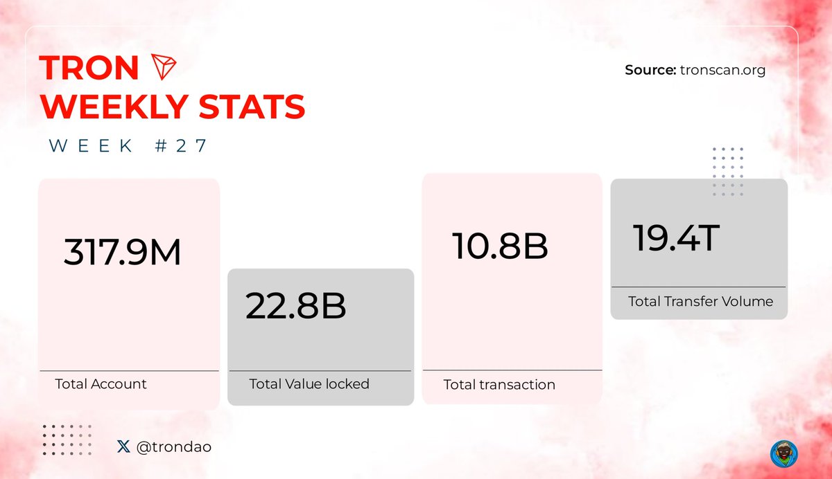 This is week #27 of @trondao stats and it's obvious Something massive is happening on TRON and most people have no idea. TRON has quietly been putting up numbers that don’t just impress, they shock 😁 → Over 317M accounts. → $22B+ in Total value locked. → Nearly 11 billion transactions. → $25 billion moved in just the last 24 hours Let that sink in. . . _____ _ _ _ You don’t grow this fast unless you’re solving real problems. You don’t handle this kind of volume unless people trust your network. . . I hope you know that when you see a chain adding hundreds of thousands of users per day, and moving tens of billions without blinking — you don’t ignore it. You lean in. You ask: what’s driving this? The answer is simple: TRON has spent years building quietly, relentlessly — refining its infrastructure, scaling its ecosystem. Moving from just gas token to a Defi power house, this is no coincidence Now it’s paying off. @justinsuntron @trondao #TRON #TRONEcoStar