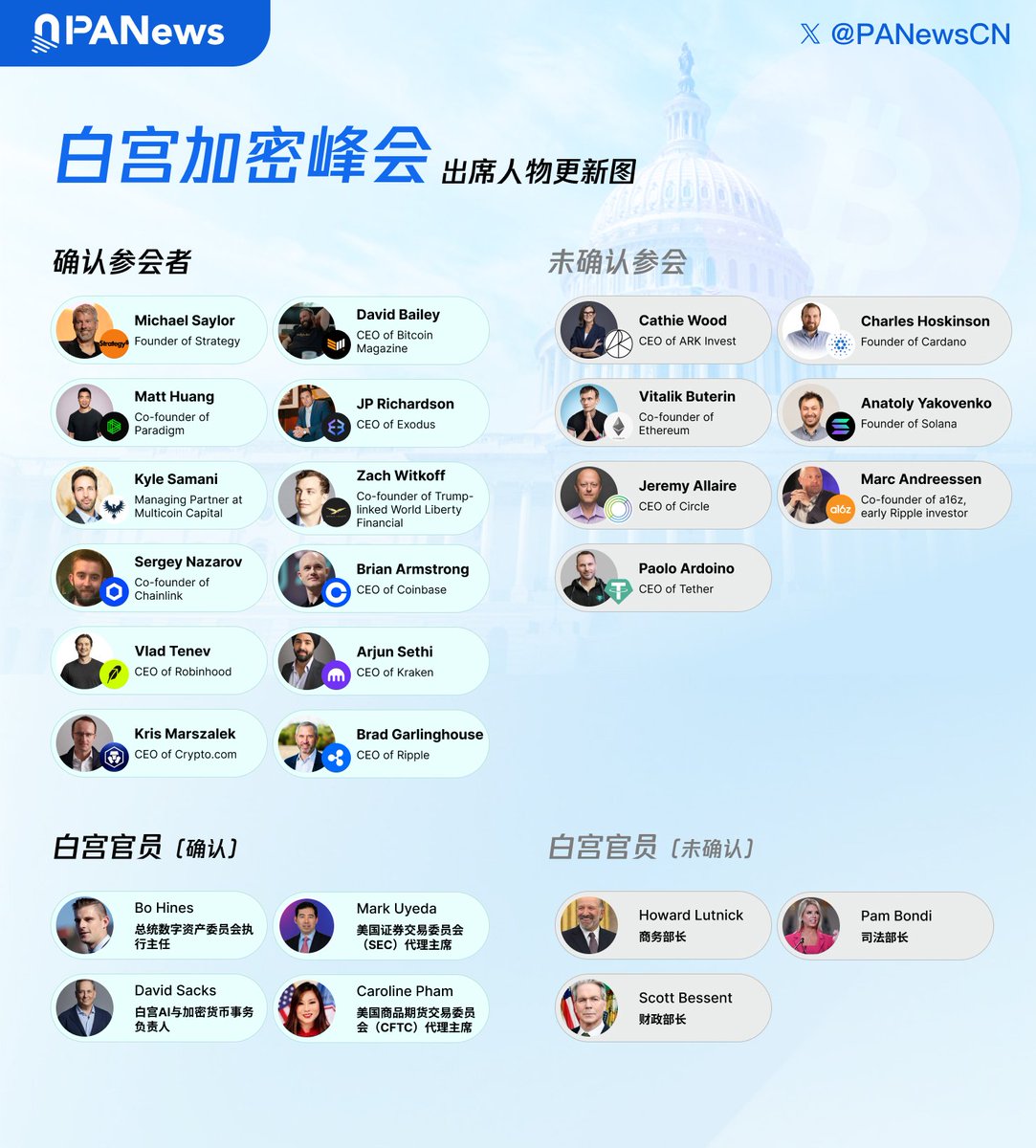白宫加密峰会,投资者必看! 摘要 本文聚焦 2025 年 3 月 7 日特朗普将举办的白宫加密峰会,从投资者视角出发,提供峰会详细信息及市场影响分析。峰会时间为北京时间 3 月 8 日凌晨 2:30 - 6:30,虽为闭门会议,但可通过官方直播(若有)、新闻媒体、X 平台等渠道获取消息。会议可能探讨加密货币战略储备、监管政策等关键议题,参会人员包括特朗普等政要及众多加密行业大咖。峰会前后,市场预计会有波动,投资者需密切关注消息、谨慎投资。同时,文章介绍了判断加密市场趋势的多种方法,包括技术分析、链上数据解读、宏观经济与市场情绪分析等,助力投资者把握市场动态。 最近,加密货币市场的动静可不小,BTC 价格突然跌破了 $85,000,行情就像坐过山车,让人心里直打鼓。而这周,整个加密市场最关注的事儿,就是新任美国总统特朗普要在 3 月 7 日举办的白宫加密峰会。这峰会可不简单,它被看作是美国政坛对加密货币态度的一个重要信号站。投资者们都眼巴巴地盯着,想知道峰会上会不会讨论加密货币战略储备、稳定币,还有加密货币监管政策这些关键问题。市场上主流币的价格,尤其是那些受政策影响大的 “政策币”,最近上上下下的,大家都在等着看美国政府接下来要出什么招。 可以说,这次峰会可不只是一场政治活动,它很可能会实实在在地影响到咱们投资者的钱包。下面,就给大家详细讲讲关于这次峰会的各种关键信息,让大家心里有底。 一、峰会啥时候开?在哪看? 时间 峰会时间是北京时间 2025 年 3 月 8 日(周六)凌晨 2:30 到 6:30,换算成美国东部时间,就是 2025 年 3 月 7 日(周五)下午 1:30 到 5:30,差不多持续 4 个小时。这个时间对咱们国内的朋友不太友好,妥妥的 “熬夜党专属”,要是想全程跟进,估计得提前冲好咖啡,做好熬夜准备。不过,这 4 个小时说不定就能决定未来几年加密市场的走向,就算不影响那么久,至少也会对短期行情有影响,值不值得熬夜,大家就得自己琢磨琢磨了。 形式 这次峰会是 “闭门会议”,也就是说只有收到邀请的人才能进入白宫现场参会,咱们普通投资者没办法直接去现场。但别灰心,还是有办法获取消息的: 官方直播(目前还没确定):白宫有可能在官网(whitehouse.gov)或者 X 平台(@WhiteHouse)发布直播链接,不过这得看白宫那边的安排,运气好才能看到。 新闻报道:像福克斯商业新闻、彭博社这些西方媒体,一般会实时报道峰会情况,结束后还会出总结报道,大家可以关注。 X 平台动态:加密圈的大 V 和参会的人可能会在 X 平台上实时分享消息,比如特朗普讲了啥,哪位嘉宾提出了重要观点。刷 X 平台可能是最快获取一手消息的办法,不过网上消息真真假假,大家得注意辨别。 后续回顾:要是没有直播,峰会结束后可能会有官方声明或者视频发布,到时候也能了解到相关信息。 小贴士 提前关注白宫和 David Sacks(@DavidSacks)的 X 账号,并且设置好提醒,这样能第一时间收到最新通知。另外,当晚 YouTube 上可能会有媒体或者 KOL 转播峰会,大家可以搜索 “White House Crypto Summit” 试试能不能找到。 二、谁会去开会? 这次峰会的主角肯定是特朗普,他会亲自主持,还会发表讲话。除了他,还有好多加密圈和政府的重要人物也会参加。下面是目前已经知道的一些关键参会人员: 政坛人士 特朗普:他对加密货币的态度,在这次会议里可是个关键 “风向标”,他怎么说、怎么做,可能会影响整个会议的走向。 David Sacks:他是白宫 AI 和加密货币负责人,来自硅谷的大佬,这次会议他起着重要作用,负责引导会议讨论方向。 Bo Hines:总统数字资产工作组的执行主任,主要负责会议的各种细节安排,让会议能顺利进行。 另外,可能还会有政府官员出席,像 SEC(证券交易委员会)或者 CFTC(商品期货交易委员会)的代表,不过目前还没有公布具体名单。 加密大咖 峰会大概会有 25 个席位。从投资的角度,为了让大家更清楚地看到可能存在的投资机会,我们把参会名单分成交易所和大机构、项目方两部分。 交易所和机构相关:[这里等待补充具体参会的交易所和机构人员名单] 项目方相关:[这里等待补充具体参会的项目方人员名单] 还有,World Liberty Financial (WLFI) 的负责人 Zach Witkoff 也会参加这次峰会。他可是特朗普力捧的 “首席加密倡导者” 团队核心,他们的持仓情况特别受关注,尤其是峰会前一天刚买入的 WBTC、ETH 和 MOVE。能在这次白宫峰会上露面,说不定就预示着未来有投资机会。 谁没来? 目前还没看到以太坊的 Vitalik Buterin、Cardano 的 Charles Hoskinson、Solana 的 Anatoly Yakovenko 这些行业大佬的名字,他们可能没被邀请,也可能是名单还没完全公布。他们没来,相关社区的人有点失望,毕竟这些大佬背后的项目在加密领域分量很重。 看点 这么多行业精英聚在一起,就像一场 “加密全明星赛”。他们背后代表的项目,还有持有的 BTC、XRP、ETH 等仓位,要是被美国政府在峰会上 “点名” 关注,那相关加密货币的价格肯定会受到直接影响。 三、会聊啥?有啥看头? 虽然峰会具体议程还没公布,但从最近的消息和加密社区大家讨论的热点来看,下面这几个话题很可能会被提到: 加密货币战略储备 特朗普之前说要把 #BTC、#ETH、#XRP、#SOL、#ADA 这些加密货币纳入美国储备,就像储备黄金一样,政府要购买并囤起来。这次峰会上可能会讨论具体怎么实施,比如买多少、怎么托管这些加密货币。要是真能落