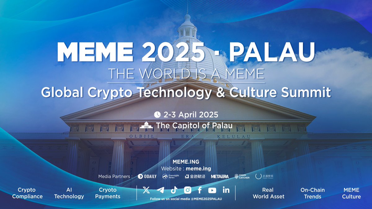 #DianDiFinance MEME 2025 · Palau Summit Supported by the Palau Government April 2-3 | The Capitol of Palau, Palau Join 100+ global experts to explore: Crypto Compliance, On-Chain Trends,Real-World Assets (RWA), Artificial Intelligence (AI), Payments, and Meme Culture THE WORLD IS A MEME Registration will open soon. Stay updated for details. Follow DianDiCaiJing @DianDiCaiJing and MEME 2025 PALAU @MEME2025PALAU #MEME2025PALAU #MEME2025 #meme #AI