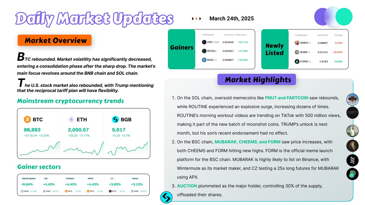 📅 2025年03月24日市场速递📈 1️⃣ 大盘概览 📊 #BTC 强势反弹,市场波动率显著回落,当前处于暴跌后的横盘修复阶段。 主流趋势聚焦于BNB链与SOL链,两者引领市场风向。 美股同样迎来反弹,特朗普透露对等关税计划将具灵活性。 2️⃣ 市场热点追踪 🔥 SOL链 #meme 新星✨ #Pnut 、#Fartcoin 等超跌品种强势反弹。 #Routine(大金狗)暴涨数十倍,其晨练视频在TikTok上爆红,收获5亿播放量,成为新一批moonshot上币对象。 #Trump 即将解锁,总统之子再度喊单,但市场反应平淡。 BSC链崛起🚀 Mubarak、Cheems、Form等项目纷纷上涨,Cheems与Form均创下历史新高。 Form作为BSC链官方meme发射平台,备受瞩目。 Muburak有望登陆BNB,Wintermute担任做市商,CZ利用APX合约测试25倍做多Mubarak。 庄股警示🚨 Auction暴跌,控盘30%的庄家大肆出货,投资者需谨慎。 🔍 Solana联创观点: #Solana 联合创始人Anatoly Yakovenko在X平台发文,明确表示“无需构建L2”,因为L1本身已具备更快、更便宜、更安全的性能优势。他强调,L1不受缓慢数据可用性堆栈限制,也无需依赖复杂的欺诈证明或多签机制,从而确保安全性不受妥协。