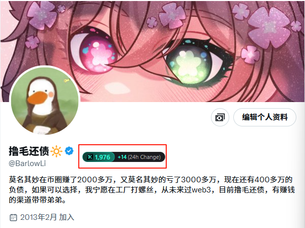 🫣 Weakness With a massive following count and heavy focus on inside crypto culture, 阿毛 risks preaching to the choir and might struggle to engage mainstream audiences unfamiliar with Web3 jargon. Their intense enthusiasm might overwhelm newcomers.