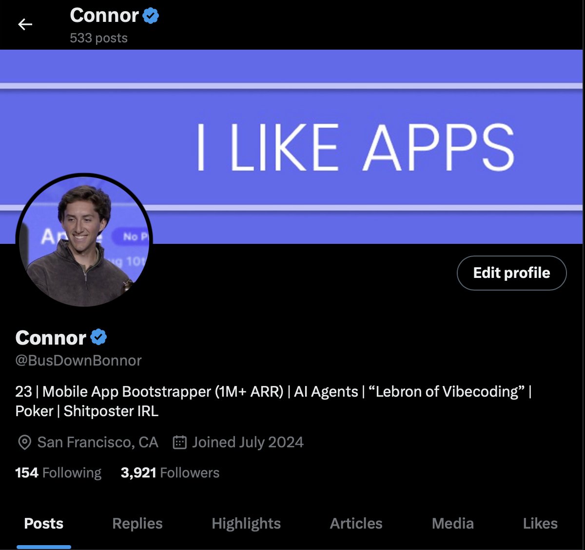 Get live statistics and analysis of Connor 's profile on X / Twitter Connor @BusDownBonnor 23 | Mobile App Bootstrapper (1M+ ARR) | AI Agents | “Lebron of Vibecoding” | Poker | Shitposter IRL