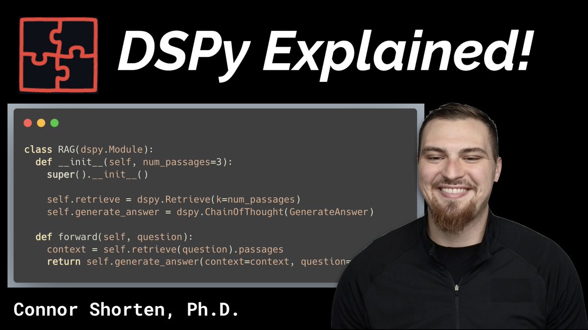 DSPy is a SUPER exciting advancement for AI and building applications with LLMs!🧩🤯 Pioneered by frameworks such as LangChain and LlamaIndex, we can build much more powerful systems by chaining together LLM calls! This means that the output of one call to an LLM is the input to the next, and so on. We can think of chains as programs, with each LLM call analogous to a function that takes text as input and produces text as output. DSPy offers a new programming model, inspired by PyTorch, that gives you a massive amount of control over these LLM programs. Further the Signature abstraction wraps prompts and structured input / outputs to clean up LLM program codebases. 🧼 DSPy then pairs the syntax with a super novel *compiler* that jointly optimizes the instructions for each component of an LLM program, as well as sourcing examples of the task. ⚙️ Here is my review of the ideas in DSPy, covering the core concepts and walking through the introduction notebooks showing how to compile a simple retrieve-then-read RAG program, as well as a more advanced Multi-Hop RAG program where you have 2 LLM components to be optimized with the DSPy compiler! I hope you find it useful! 🎙️ youtube.com/watch?v=41EfOY…