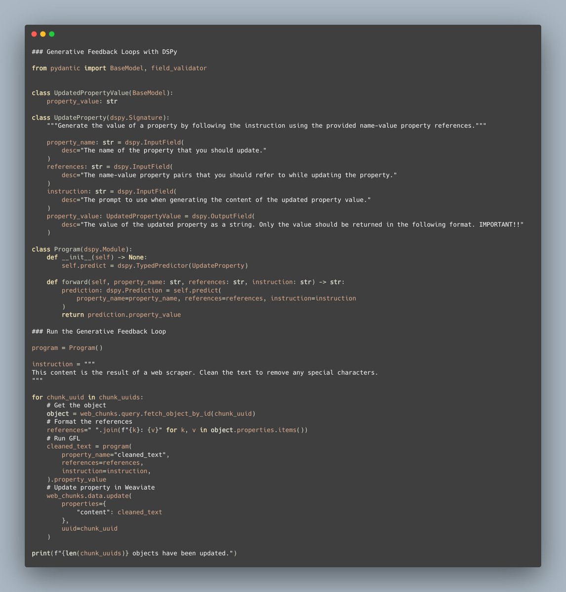 Adding Depth to DSPy Programs!! I am SUPER excited to share a new video exploring what it means to add depth to DSPy programs! 🚀 One of the headlines of DSPy is the comparison with PyTorch, whereas layers == sub-tasks as we decompose complex tasks like writing blog posts or question answering into their components. 🧱 This has all sorts of interesting aspects to it, this video begins by explaining how each component has an optimal task description, as well as unique input-output examples. We then explore how the BootstrapFewShot compiler not only sources examples for each of these sub-tasks, but also Chain-of-Thought reasonings for them! We then dive further into `BootstrapFewShot`, taking a look at the code to understand exactly how DSPy orchestrates using a teacher LM to trace through the program and produce these examples! 🧐 Another super powerful aspect of DSPy is the ability to compose Multi-Model systems, such as using Cohere's Command Nightly for the Query Wiriting, Mistral 7B for Summarization, and GPT-3.5-Turbo for Question Answering! 🔌 I hope you enjoy the video! As always the code examples can be found on GitHub at Weaviate/Recipes! 🧑🍳 YouTube: youtu.be/0c7Ksd6BG88