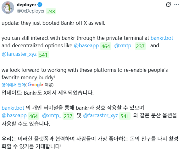 \n\n์ต๊ทผ ๊ทธ๋ฆฌ๊ณ ๊ฐ๋ฐ์์ธ 0xdeployer๋ Bankr SDK๋ฅผ ์ฌ์ฉํ์ฌ x402๊น์ง ํตํฉํ๋๋ฐ์, ์ด์ ๋ ์กฐ๋ง๊ฐ ๊ด๋ จ ์นํฐ์์ ๋๋์ฑ ํ์ฉ๋๊ฐ ๋์์ง ๊ฒ์ผ๋ก ์๊ฐ๋ฉ๋๋ค!\n\n11์์ Base App๋ ์ถ์ ์์ ์ธ ๋งํผ, ๊ทธ ํต์ฌ์ธ $BNKR ๋ฐ๋์ ์ฑ๊ฒจ๋ด์ผ ํด์ผ๊ฒ ์ฃ ? ์๋ฌด๋๋ Base ์ ์ฒด ์ฒด์ธ์ ํต์ฌ์ธ ๋งํผ์!","in_reply_to_user_id_str":null,"in_reply_to_status_id_str":null,"is_quote_status":1,"is_ai":null,"ai_score":null},{"bookmarked":false,"display_text_range":[26,64],"entities":{"hashtags":[],"symbols":[],"timestamps":[],"urls":[],"user_mentions":[{"id_str":"1779083547476922368","name":"dibo","screen_name":"Hoon11221","indices":[0,10]},{"id_str":"1813464381432504320","name":"STBL","screen_name":"stbl_official","indices":[11,25]}]},"favorited":false,"in_reply_to_screen_name":"Hoon11221","lang":"ko","retweeted":false,"fact_check":null,"id":"1983528745542750538","view_count":9,"bookmark_count":0,"created_at":1761745079000,"favorite_count":1,"quote_count":0,"reply_count":1,"retweet_count":0,"user_id_str":"1775133077125423104","conversation_id_str":"1983507893115593204","full_text":"@Hoon11221 @stbl_official ๋ณดํต ์ฌ๋๋ค ๊ธ ์๊ณ์ ์ด ๊ธ 3๊ฐ์ธ๊ฑฐ๊ฐ๋๋ฐ ๊ทธ์ ๋๋ฉด ๋ซ์ผ์ค๊ฑฐ๊ฐ์ต๋๋ค!","in_reply_to_user_id_str":"1779083547476922368","in_reply_to_status_id_str":"1983507893115593204","is_quote_status":0,"is_ai":null,"ai_score":null},{"bookmarked":false,"display_text_range":[39,89],"entities":{"hashtags":[],"symbols":[],"timestamps":[],"urls":[],"user_mentions":[{"id_str":"1463138156618735620","name":"Y์ ์ด.M | ๐ ๐RIVER","screen_name":"yunjae44024216","indices":[0,15]},{"id_str":"1678513621264142336","name":"vooi","screen_name":"vooi_io","indices":[16,24]},{"id_str":"1762471547485184000","name":"Cookie DAO ๐ช","screen_name":"cookiedotfun","indices":[25,38]}]},"favorited":false,"in_reply_to_screen_name":"yunjae44024216","lang":"ko","retweeted":false,"fact_check":null,"id":"1983538255636398445","view_count":41,"bookmark_count":0,"created_at":1761747347000,"favorite_count":1,"quote_count":0,"reply_count":1,"retweet_count":0,"user_id_str":"1775133077125423104","conversation_id_str":"1983531019543396540","full_text":"@yunjae44024216 @vooi_io @cookiedotfun ๋ง์์ ์ ๋ ์ด์ง๊ฐํ๋ฉด ํค์๋ ์ ์์ฐ๋ํธ์