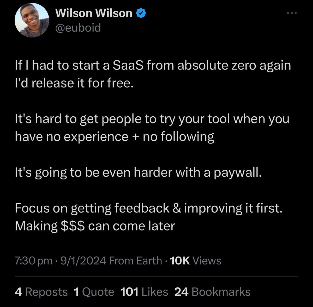 Day 1 of #100DaysToSolopreneur Achievement Unlocked: Make first $1 I MADE MY FIRST SALE! Since starting this challenge 24 hours ago I have been absolutely blown away by the support in every direction. On top of the likes, comments and follows i’ve also had people reach out privately to say they’ll be starting the challenge too! I really hope if you’re looking at taking the first step this motivates you. @callmeeugenius, myself and others embarking on this journey are petrified too - but we’ll get further together. Now, what have I been up to over the past 24 hours? I had planned to spend my time today on preparing for the launch of my first product. But, within an hour of posting my first step last night I had my first sale! What?! How did this happen? Let me explain what and how! First, what did I even sell? A lifetime deal for the first project of this adventure - ColourEasy. ColourEasy is what happens when a developer and accessibility consultant starts spending a bunch of time with the brilliant designers here on X and notices no one has really solved one of their largest problems. Colours that POP! C’mon. We’ve all seen it! Beautiful professional design studio landing pages with more purple than a cadbury wrapper. Playing it safe, because much to contrary belief being a Designer is a human-centric process. Bold, dynamic colour palettes take time, testing and refinement. Well, they used to. Simply, upload your brand asset. Then ColourEasy extracts and analyses your existing palette to instantly recommend tailored, accessible colours that are guaranteed to make you stand out. The lifetime deal as picked up by @MichaelScottBlu is available only for the first 50 (now 49) orders. To be honest, I thought the first time I would mention ColourEasy by name would be at least a couple weeks away. I had a marketing plan, you might have noticed the seeds in my recent colour-focused polls. I thought i’d share a few teaser videos, then drop a link! I’ve seen how it works on X and drive a bit of ‘hype’ is always worthwhile. But, we’ve had to accelerate the plan a little bit because i’m committed to this 100 day journey and #buildinpublic and I couldn’t keep this from the wonderful people that have joined this journey. How did I sell it? I built community. I stopped hesitating. I showed proof. Build Community When I first started on X I jumped into building a product called Qruickly to learn about productising a service. I met some amazing developers, designers and founders. The first time I posted a screenshot of the homepage of Qruickly, half a dozen people jumped on to provide valuable feedback - for free! I was blown away. I was immediately committed to trying to provide the same value. I will never stop commenting on posts asking for advice, sharing great ideas and at least a couple times a week i’ve slid into someone’s DMs to provide some free consulting. (I even had some of the greats like @lizengco provide roasts for my landing page). So when I saw @MichaelScottBlu’s post looking for new tools I knew I needed his eyes on my new project. I did not expect him to purchase a lifetime plan. Building community allows me to give and receive opportunities I would never have encounter otherwise. Stop Hesitating But I didn’t comment on that post straight away. What if I didn’t deserve it? What if ColourEasy wasn’t ready? What if ColourEasy was ready, but I wasn’t? I’ve asked myself variations of those questions a hundred times. The common term for this is Imposter Syndrome. I’ve given presentations and public talks on Imposter Syndrome like i’m some expert on confident zen- I’m not. I asked myself variations of these questions when my partner and I opened Good Growin’ Mushrooms just three months ago. We’re just about to hit six figures in revenue. Stop hesitating - the worst is guaranteed if you do. Show Proof Social proof. Proof of commitment. Proof of product. I’m unsure which one swayed Michael in the end. (I’d like to think an overwhelming mix of the three?) I know what i’m an expert in and I stick to sharing value and insights related to these topics. But that’s not all social proof requires. I also don’t pretend to be an expert in something i’m not and I ALWAYS ask the question instead of pretending to know the answer. That means i’m surrounded by people that can be confident in my expertise, comfortable questioning me and trusting in our relationship. I first spoke to Michael quite near to the beginning of my journey on X. Back then I promised to stick around, to keep trying and failing. So did dozens of people, that I don’t see around anymore. I didn’t show false wireframes of what the project could~ be or send a 5 minute pitch video. An idea should be validated on it’s merit not a pipedream of what it could be. Whilst I know if I had waited a couple days I could have made the improvements to UI that I wanted, a customer wants to know if a tool will solve a problem now. It’s clear that when Colour Easy is launched it solves the problem from Day 0. So what’s next? We’ve hit our first goal of $1 much faster than expected. Remember, by day 100 we’re after $10k revenue and 3K MRR. Our next milestone: $75/100 revenue. $0/1 MRR. To achieve this we’ll pivot and adapt the original release plan. Over the next day i’ll finalise my list of early adopters and reach out to offer them exclusive deals and early access. This will be essential to gather early user feedback and prioritise features these users want. Luckily, some of these won’t be ‘cold’ calls due to that community building. Michael has also put on his Christmas elf hat and we’ll be giving away a lifetime license of ColourEasy soon. Secrets out! Link in first comment.