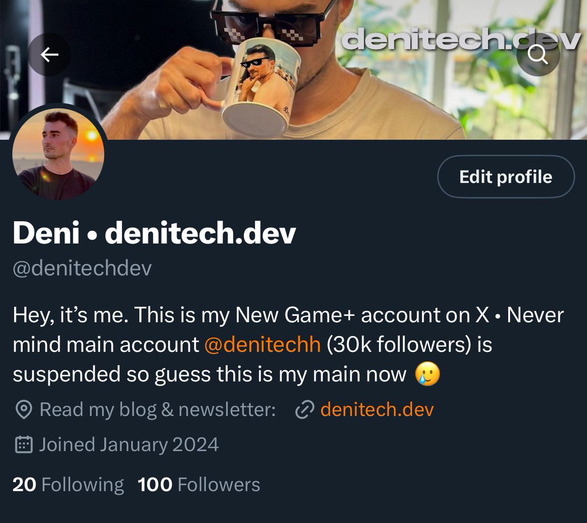 Deni is a tenacious software engineer on the brink of a major breakthrough with a dream job at Google London in 2025. Despite the witty and casual tone, Deni shows persistent ambition and resilience, especially after overcoming account suspension setbacks. Balancing humor with serious goals, Deni engages followers with a mix of personal milestones and light-hearted banter.