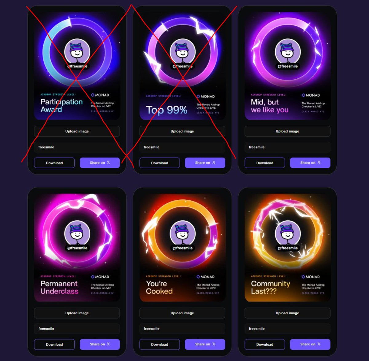 The picture I sent this morning with Monad card isnโt real. Itโs Photoshop. Iโm not eligible. I donโt even have FA. But Iโm not here to complain about it. I just want to show you something: ๐ monadcards.site Hereโs a site where you can create your own Monad card, at whatever level you want. Of course, it wonโt make you eligible for the airdrop, but it might make someone smile. Everythingโs free, give it a try. Hereโs how: 1โฃ Choose your card level 2โฃ Upload your photo 3โฃ Enter your nickname 4โฃ Download your Monad card