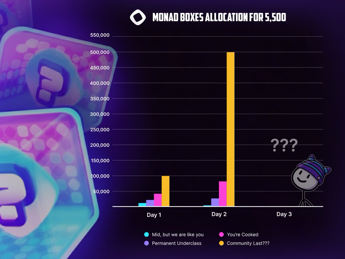 I analyzed tweets with MON allocations for 5,500 community members over the past two days. For Community Last, yesterday was truly a โgolden day.โ The team generously rewarded the most active participants, distributing over 500,000 MON. However, not everyone received large allocations some members at the same level only got 100โ200k MON. Allocations for the Youโre Cooked and Permanent Underclass tiers slightly increased or remained unchanged, ranging from 50,000 to 100,000 MON over two days. For the Mid, but we are like you tier, allocations were reduced several times over. On the second day, this level received only 1,000โ2,000 MON. I even saw someone get just 1 MON ๐ I also looked into allocations for some of the 225,000 other participants (NFT holders and major traders) even in a single day, they received amounts several times higher than those at the Mid, but we are like you level. I believe the team selected these 5,500 people not just to hand out ~$200 to the lower tiers. Letโs see what happens on day three. Overall, the team has achieved its goal the entire Crypto Twitter is talking about Monad. Excellent marketing, excellent execution. Great job, @monad. โ ๏ธ P.S. The data is based on tweets; some may be fake, so donโt take it as 100% verified information.