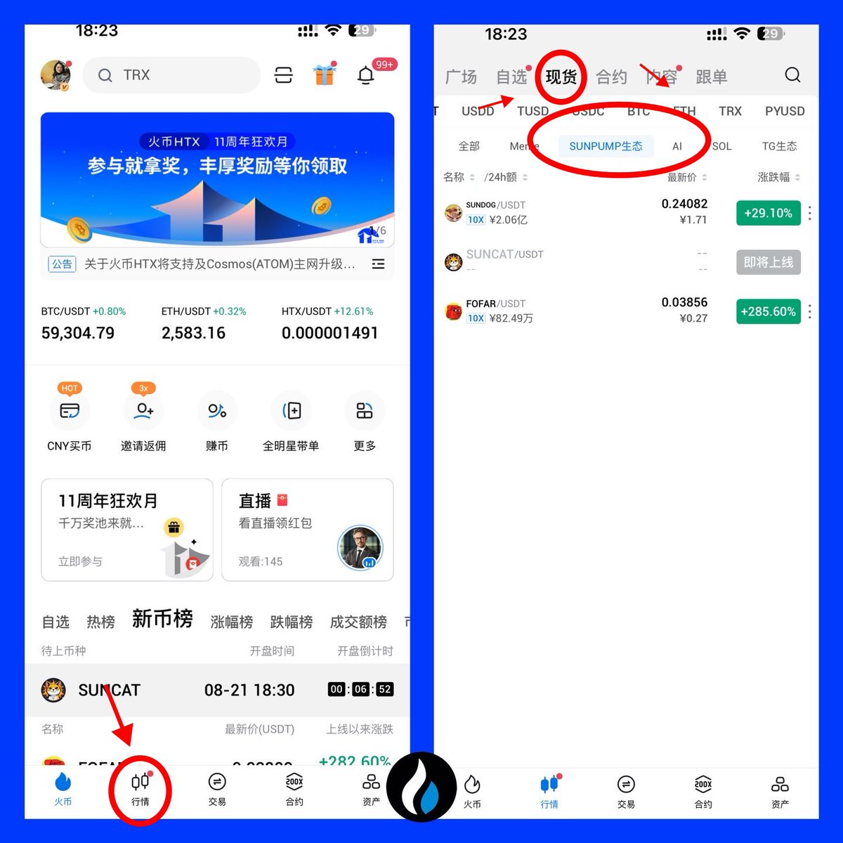 用户可在火币首页的【行情】-【现货】-【SUNPMUP生态专区交易】交易 #SUNCAT#SUNDOG#FOFAR