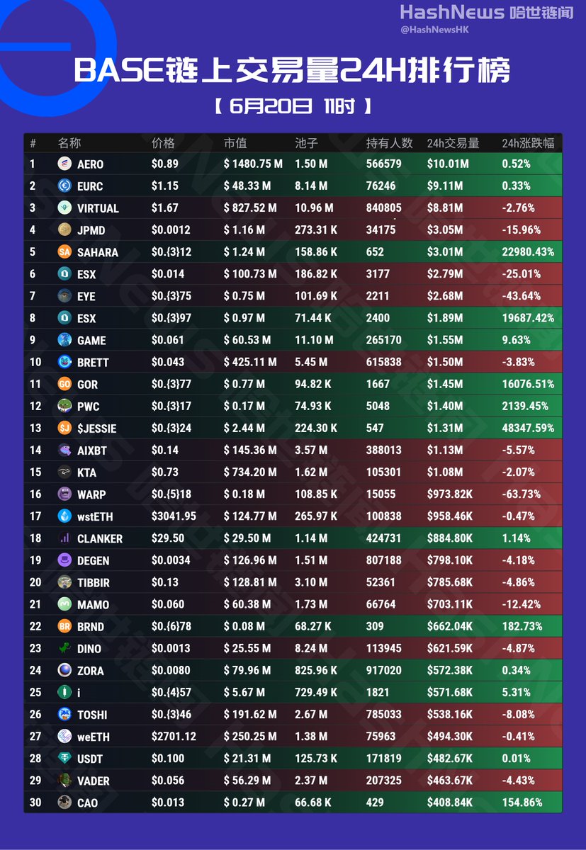BASE 链上24小时成交额排行榜(6月20日) $AERO $EURC #VIRTUAL $JPMD $SAHARA $ESX $EYE $ESX $GAME $BRETT $GOR $PWC $JESSIE $AIXBT $KTA $WARP $wstETH #CLANKER $DEGEN $TIBBIR $MAMO $BRND $DINO $ZORA $i $TOSHI $weETH $USDT $VADER $CAO @memebestbot @zhuilong888 @yiyun_dan1 @wananMa1 @OKCX66 @jjsqqk @kaiun69 @neroclub01 @Amy6Tina