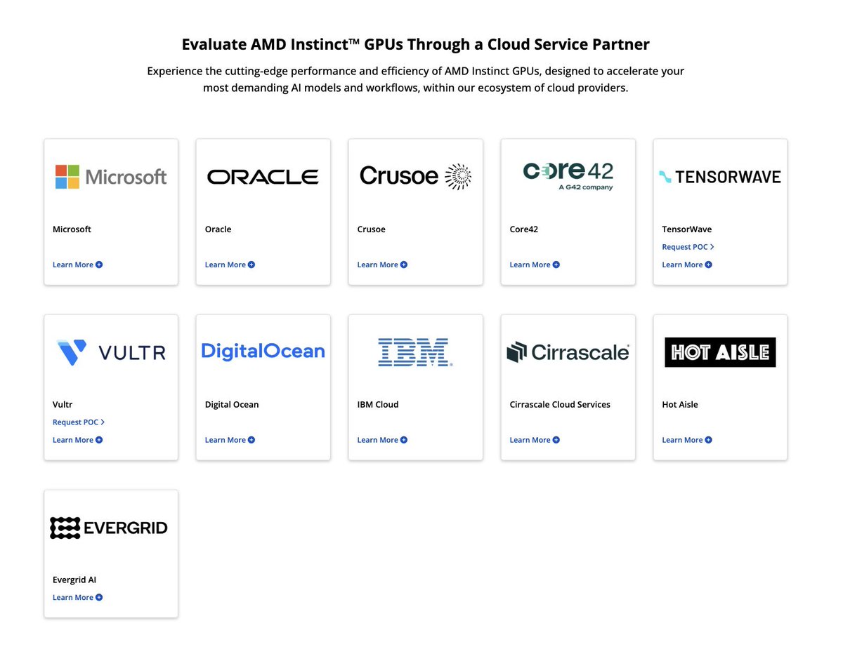Iām really proud of being an official @AMD Cloud Service Partner. We started with a proof-of-concept of just 8 GPUs, our entire funding is probably equal to a single month of these companiesā budgets and we are just three people with a sales / marketing budget of zero. This makes us the most capital efficient NeoCloud out there. Of all these offerings, weāve built the most automated, lowest-friction onboarding experience, backed by the best customer support, as the foundation for long-term growth. Two names recently dropped off the list, so the fact that weāve made it this far and listed along with giants, is pretty incredible to me. Ever bullish $AMD. ssh admin.hotaisle.app hello@hotaisle.ai