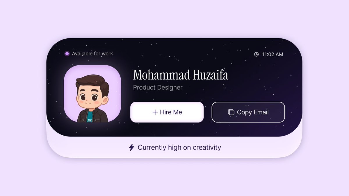 Huzaifa is a passionate frontend developer on a creative quest to master design, fearlessly diving into new challenges like Satya's 30-day design journey. With an eagerness to learn and a knack for turning inspiration into original work, Huzaifa invites feedback and community interaction to grow. This profile radiates artistic exploration mixed with technical skill, crafting a unique digital presence one design at a time.