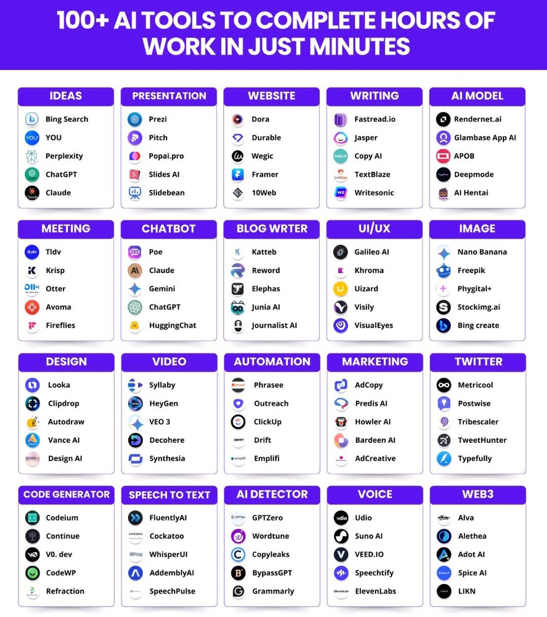 100+ AI tools to finish months of work in minutes. 1. Presentation - Gamma AI - Bricks AI - Designs AI - Beautiful AI 2. Research - ChatGPT - Claude - DeepSeek R1 - Gemini - Perplexity 3. CopyWriting - Rytr - Copy AI - Writesonic - Adcreative AI - otio 4. Writing - Jasper - HIX AI - Jenny AI - Textblaze - Quillbot 5. Website - 10Web - Durable - Framer - Style AI - Landingsite 6. Video - Sora - Kling - Pika - InVideo - HeyGen - Runway 7. Meeting - Tldv - Otter - Noty AI - Fireflies 8. SEO - VidIQ - Seona AI - BlogSEO - Keywrds ai - Seona 9. Chatbot - Droxy - Chatbase - Mutual info - Chatsimple 10. Image - Midjourney - Dall E-3 - Flux - Stability AI - Grok 11. Automation - Make - Zapier - Xembly - Bardeen 12. UI/UX - Figma - Uizard - UiMagic - Photoshop 13. Design - Canva - Flair AI - Clipdrop - Autodraw - Magician design 14. Logo Generator - Looka - Designs AI - Brandmark - Stockimg AI - Namecheap 15. Audio - Lovo ai - Eleven labs - Songburst AI - Adobe Podcast 16. Startup - Tome - Ideas AI - Namelix - Pitchgrade - Validator AI 17. Productivity - Merlin - Tinywow - Notion AI - Adobe Sensei - Personal AI 18. Social media management - Tapilo - Typefully - Hypefury - TweetHunter Follow @I_Muhammadali44 for more AI-related stuff.
