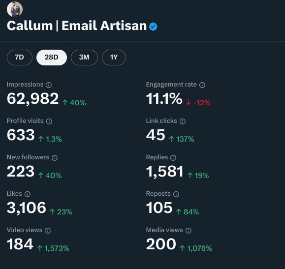 Get live statistics and analysis of Callum | Email Artisan's profile on X / Twitter