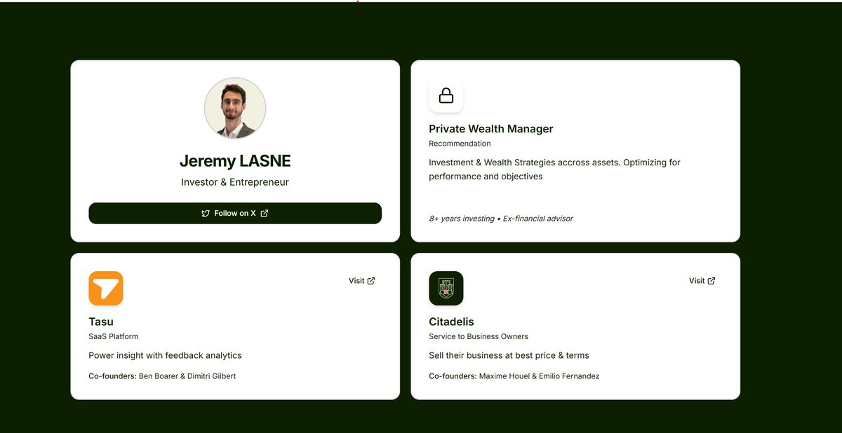 {"data":{"__meta":{"device":false,"path":"/creators/JeremyLasne"},"/creators/JeremyLasne":{"data":{"user":{"id":"834380309978312704","name":"Jeremy","description":"Sharing my journey, trying smart moves\n📣 https://t.co/sjbiM4pRMT User-first business growth","followers_count":471,"friends_count":211,"statuses_count":3383,"profile_image_url_https":"https://pbs.twimg.com/profile_images/1986893288528351232/F21QEfrk_normal.jpg","screen_name":"JeremyLasne","location":"Paris, France","entities":{"description":{"urls":[{"display_url":"Tasu.ai","expanded_url":"https://Tasu.ai","url":"https://t.co/sjbiM4pRMT","indices":[42,65]}]},"url":{"urls":[{"display_url":"jeremylasne.com","expanded_url":"https://jeremylasne.com","url":"https://t.co/5AM2nuLjyl","indices":[0,23]}]}}},"details":{"type":"The Entrepreneur","description":"Jeremy is a sharp-minded entrepreneur who thrives on smart business moves and relentless feedback. He shares his journey transparently, focusing on user-first growth and clear, actionable insights. Jeremy embodies the grit and adaptability required to build and scale successful ventures.","purpose":"To empower entrepreneurs and solopreneurs to build sustainable, user-centric businesses by leveraging honest feedback and simplification. Jeremy’s life mission is to transform complex business challenges into straightforward, effective strategies that drive growth and value.","beliefs":"Jeremy believes in the power of brutally honest feedback as a catalyst for growth and innovation. He values simplicity over complexity, prioritizing products and pitches that are easy to understand and deliver clear value. He holds that business success stems from relentless listening to customers and continuously iterating from insights.","facts":"Fun fact: Jeremy started his journey as an investor and later transitioned into entrepreneurship, giving him a rare dual perspective on company growth and negotiations.","strength":"His greatest strength lies in his ability to listen intently to feedback and rapidly iterate on his business strategies, combined with a clear focus on user-first product design and value communication.","weakness":"Jeremy's straightforward approach, while effective, can sometimes come off as 'brutally honest,' which might alienate softer audiences or lead to misunderstandings when delicacy is needed.","roast":"Jeremy’s pitch is so sharp and brutally honest, you’d probably need a tetanus shot after every call — but hey, at least you know he’s not sugarcoating a thing, even if it means occasionally turning potential clients into reluctant roast victims.","win":"Successfully rebuilt his pitch after a harsh critique, landed a key client on the next call, exemplifying resilience and adaptability in action.","recommendation":"To grow his audience on X, Jeremy should leverage more storytelling around his investor-to-entrepreneur transition and share behind-the-scenes lessons from real negotiations. Engaging followers with interactive Q&A sessions about feedback strategies and simplifying SaaS products will deepen community trust and boost engagement."},"tweets":[{"bookmarked":false,"display_text_range":[0,277],"entities":{"hashtags":[],"symbols":[],"timestamps":[],"urls":[],"user_mentions":[]},"favorited":false,"lang":"en","retweeted":false,"fact_check":null,"id":"1978734794105143466","view_count":4148,"bookmark_count":1,"created_at":1760602112000,"favorite_count":72,"quote_count":1,"reply_count":51,"retweet_count":3,"user_id_str":"834380309978312704","conversation_id_str":"1978734794105143466","full_text":"Be obsessed with feedback!\n\nAs solopreneur/CEO, your job is to listen to feedback and manage your business (/run it).\n\nJeff Bezos built Amazon by listening relentlessly to feedback, answering emails, and turning insights into innovation.\n\nThat's how you get Product Market Fit.","in_reply_to_user_id_str":null,"in_reply_to_status_id_str":null,"is_quote_status":0,"is_ai":null,"ai_score":null},{"bookmarked":false,"display_text_range":[0,80],"entities":{"hashtags":[],"symbols":[],"timestamps":[],"urls":[],"user_mentions":[]},"favorited":false,"lang":"en","retweeted":false,"fact_check":null,"id":"1962553753631965534","view_count":4237,"bookmark_count":3,"created_at":1756744252000,"favorite_count":55,"quote_count":4,"reply_count":67,"retweet_count":1,"user_id_str":"834380309978312704","conversation_id_str":"1962553753631965534","full_text":"What stage are you at?\n\nIdeate\nBuilding\nLaunching / shipping\nScaling / surviving","in_reply_to_user_id_str":null,"in_reply_to_status_id_str":null,"is_quote_status":0,"is_ai":null,"ai_score":null},{"bookmarked":false,"display_text_range":[0,279],"entities":{"hashtags":[],"symbols":[],"timestamps":[],"urls":[],"user_mentions":[]},"favorited":false,"lang":"en","retweeted":false,"fact_check":null,"id":"1979459687926964265","view_count":2097,"bookmark_count":6,"created_at":1760774940000,"favorite_count":43,"quote_count":0,"reply_count":30,"retweet_count":1,"user_id_str":"834380309978312704","conversation_id_str":"1979459687926964265","full_text":"A SaaS with multiple feature will fail\n\nWith most SaaS products launched today are self-service products.\n\nWhat is it?\n\nusers must be able to learn your product by themselves within seconds. Even though you can add videos and social content to showcase features,the real magic is when the product is so easy, users just get it.\n\nThe best projects aren’t about endless features,\nbut making it as simple as possible.\n\nTrue perfection isn’t when there’s nothing left to add, but when there’s nothing left to remove.\n\nMost of the business I see gave too much features...","in_reply_to_user_id_str":null,"in_reply_to_status_id_str":null,"is_quote_status":0,"is_ai":null,"ai_score":null},{"bookmarked":false,"display_text_range":[0,279],"entities":{"hashtags":[],"symbols":[],"timestamps":[],"urls":[],"user_mentions":[]},"favorited":false,"lang":"en","retweeted":false,"fact_check":null,"id