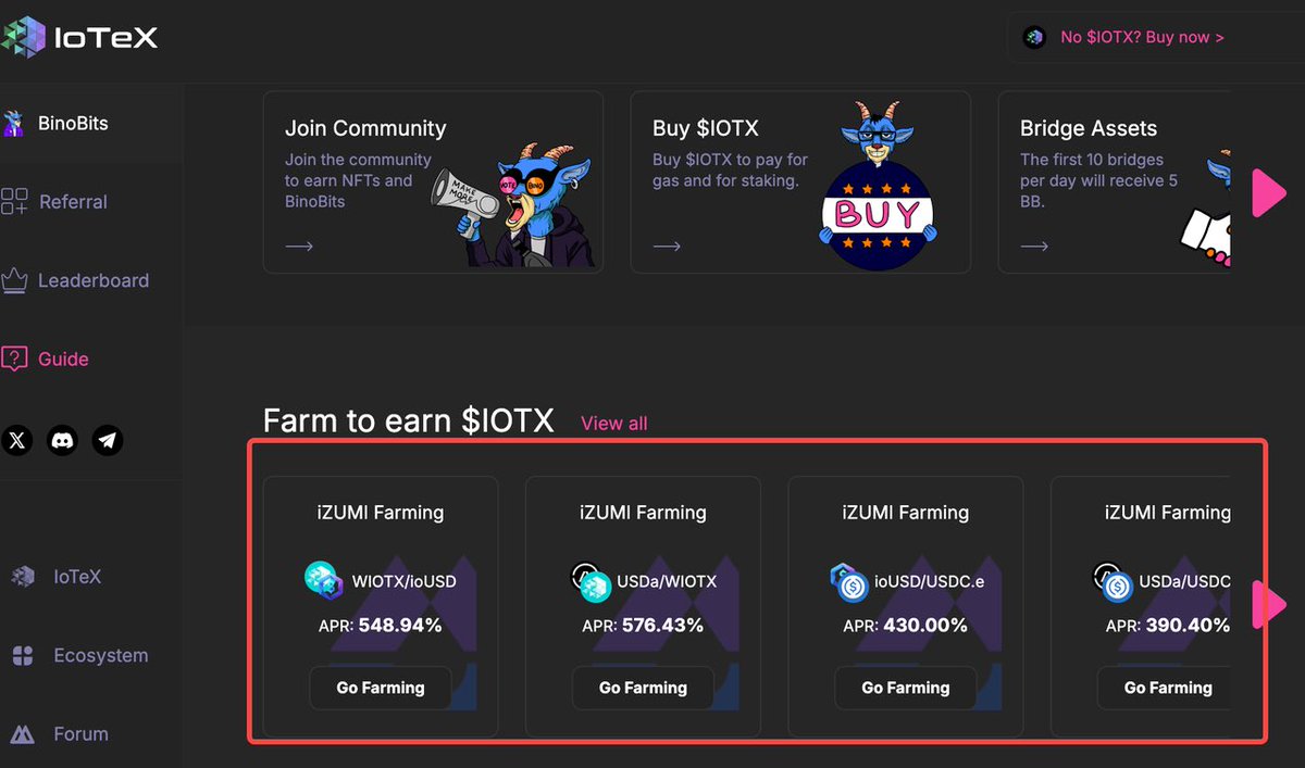我噻,参与IoTeX活动收益居然这么高! 在BN、Coinbase、Upbit上,$IOTX目前提供近600%的年化收益率。即使你在忙于PvP游戏,也别错过这个赚取高回报的机会。 IOTEX作为DePIN(去中心化物联网)的领先链,正将生态做的越来越火爆。其中WIOTX挖矿提供了极高的APR。 赚钱策略 ➥直接从BN提取$IOTX到IoTeX链,参与挖矿。 ➥如果担心无常损失,可以在BN上开空单对冲,仍可获得稳定的高APR。 同时新上线的USDC.e/USDa池子在Izumi平台上提供了400%的APR。 USDC.e是跨链的USDC,而USDa是通过Avalon借贷平台发行的稳定币。 如果5000U投资,每天可赚取53U,一周下来收益可达370U,这种无风险的高收益可以安心投资更多项目。 这种高收益的机会在当前市场中非常具有吸引力,不仅适用于新手,也为老手提供了稳定增值的途径。 izumi 链接:izumi.finance/farm/iZi/dynam… 活动链接:goat.iotex.io/referral?ref=b… @iotex_io @iotex_cn @Raullen