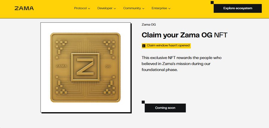 🟨🟨🟨 Kèo @zama_fhe đã sắp nổ Airdrop rồi ae! Quy trình chờ Airdrop Q4->Q1/26 vẫn là @zama_fhe -> @Lighter_xyz -> @SoSoValueCrypto 🧲 Zama Supply 3500 NFT OG và đã có trang claim chính thức. ✅ Giờ ngồi đếm cua định giá 1 NFT xem được bao nhiêu $ETH 😆😆 Ss3 nhiều trại farm + fomo của nhiều users nên cạnh tranh ác lắm. Hi vọng ae bỏ đủ công sức sẽ được lụm NFT và bú Airdrop @zama_fhe nhé! Còn có Ss4 hay ko thì mình ko biết nhưng theo mình end Ss3 xong nổ air là đẹp. Mình cũng sẽ sang @stable để lấy vị thế. Chỉ vậy thôi, airdrop đơn giản là bào rồi thì đợi lụm tiền kkk #ZamaCreatorProgram