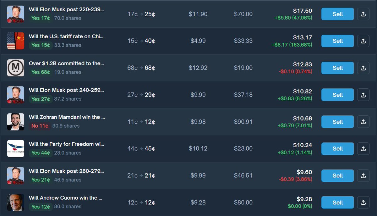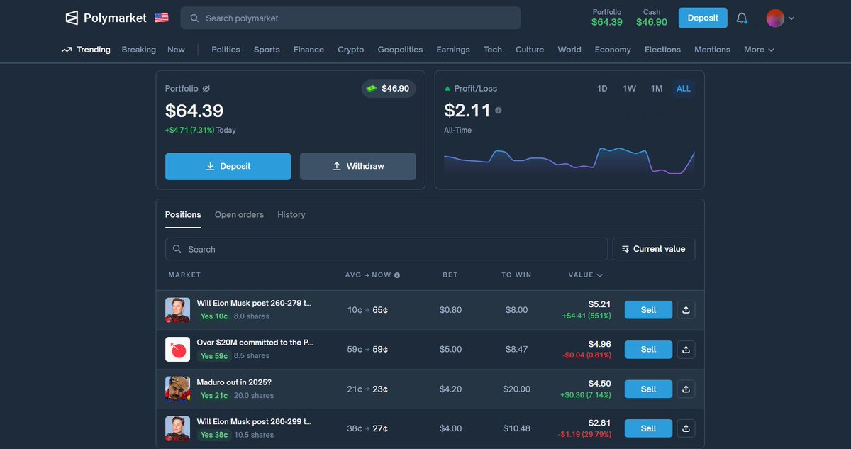 Fun fact: Kyle once turned a modest market share investment into a 6x profit by timing his entry and exit perfectly during an Elon Musk tweet prediction market — a true polymarket money glitch master!