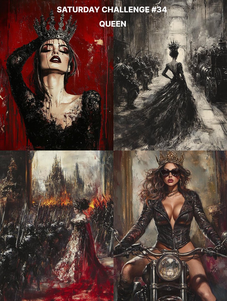 🎨 SATURDAY CHALLENGE #34 🎨 VERY IMPORTANT : First, be sure to follow ALL the rules described below. The image with more likes AND following ALL rules will decide prompt next week. * RULES * : Share only ONE image and ANY PROMPT YOU WANT, use ANY TOOL you want . NO QUOTE because this will be diluted and impossible de catch up. Share the prompt if you want to learn together - The theme is "QUEEN” by @FemmesnFiends IMAGES COVERS DONE BY :@FemmesnFiends (Find them in comments too ) I won't ask to tag people , do as it please you , I just want people to be free , no pressure no obligation.. Enjoy... 1/2