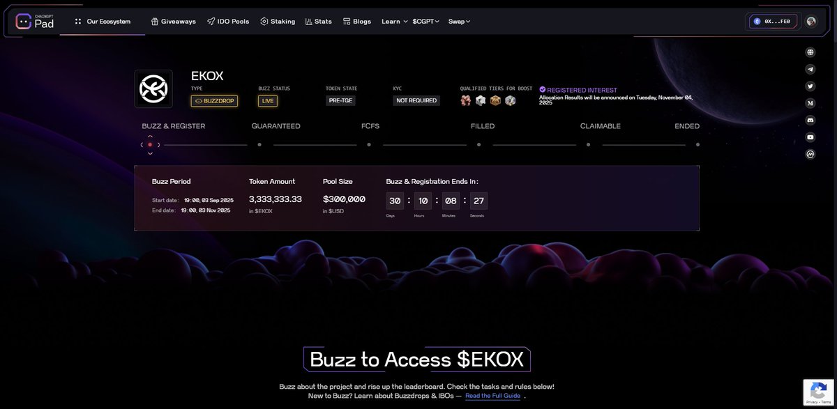 Today is Day 1 of the public sale, and the doors are still open. The public token sale of @ekoxofficial has officially started a memorable milestone in the journey to build a truly connected Web3 ecosystem. 🔹 Restaking Protocol: Mainnet ready, aiming for safer capital efficiency and higher scalability. 🔹 EkoxPay: Connecting digital assets to real-world payment applications. 🔹 AI Cube: Bringing intelligent automation and AI technology to DeFi infrastructure. The tokenomics were thoughtfully designed with long-term sustainability in mind not short-term hype. A bi-monthly release over 20 months keeps the supply steady and healthy. $EKOX isn’t just a token it’s a small step toward a simpler, smarter Web3 experience for everyone. pad.chaingpt.org/pools/ekox sale.ekox.com #EKOX #ChainGPT $CGPT @Chain_GPT @ChainGPT_Pad