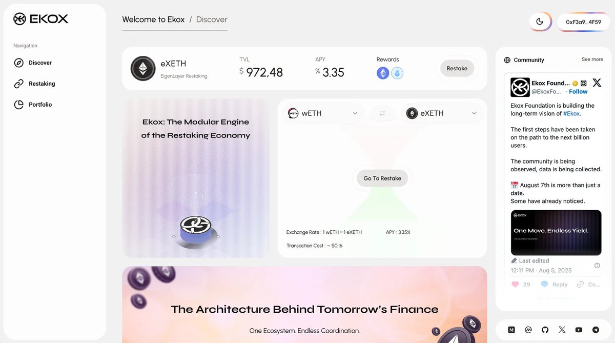 DeFi is growing 🌐 Demand for Perp Dexes is growing, but I believe Restaking is the next wave. @ekoxofficial is building an innovative product: Stake ETH → get liquid eXETH Automatic compounding Secured by EigenLayer ⚡ Over 70M$ TVL + 500K txs on testnet ⚡ Intuitive interface, fair tokenomics, attractive rewards TGE is coming, the growth momentum is impressive. It's time to experience and get ready for mainnet 🚀 Early access to this gem is happening here → pad.chaingpt.org/pools/ekox #EKOX $EKOX #ChainGPT $CGPT @Chain_GPT @ChainGPT_Pad