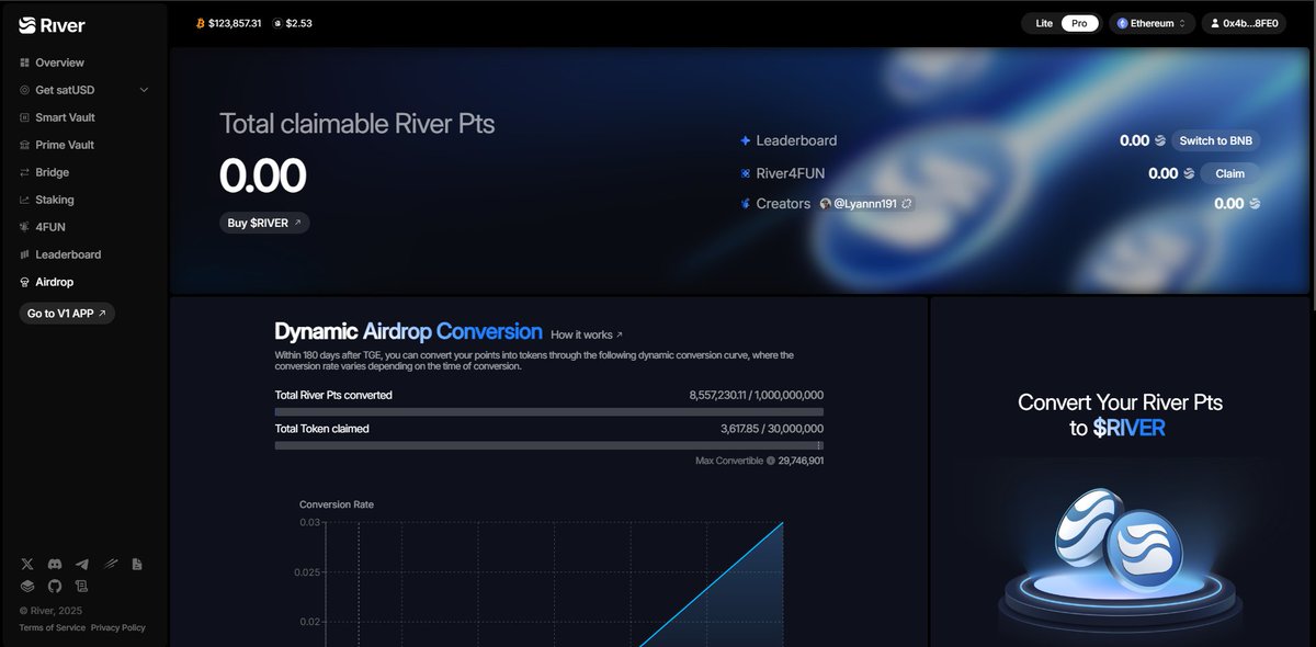 River redefines the risk model of Stablecoin! In DeFi, the scariest thing is liquidation. Maker, Aave, Liquity → force positions to liquidate when volatile, users lose money, the protocol loses credibility. River goes against: liquidation risk model = 0. 🚫 No magic, just design: Collateral is on the original chain satUSD is minted natively on the target chain Volatility risk is dispersed & reabsorbed Smart Vault + Prime Vault create a dynamic buffer from revenue + DeFi profit + staking → no need for liquidation. 👉 Result: Users are safer No more liquidation limit CeFi-like stability, DeFi transparency River turns stablecoins from preventing collapse → absorbing volatility. Maybe this is the new direction of CDP. 🚀 Unlock passive income with $RiverPts staking! Zero extra cost, massive rewards. Join the revolution @River4FUN app.river.inc/?ref=Lyannn191 #CryptoRewards