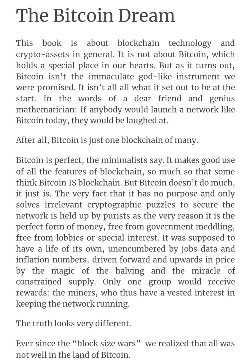 #Bitcoin was supposed to bring financial freedom from institutions and governments in a world where everyone paid in that new “e-cash”. This never happened. Centralized Bitcoin mining was never the plan. “Digital gold” was never the plan. Now, with ETFs, bitcoin is just another asset in the armory of financial planners wishing to improve their Sharpe ratio. A little excerpt from my upcoming book “A Blockchain Odysee” For some, Bitcoin's attraction lies in its purity and the limited supply. It's simple, uneventful, boring. You just buy it and hodl it, one day you will be unimaginably rich. Michael Saylor certainly will. But for those of us working in cryptography and decentralized computing, #Bitcoin hardly matters. It is not the holy grail of decentralization or the symbol of resistance against the establishment. We don't care if it goes to 400k, 1m or drops to zero. The 21 million supply cap isn't set in stone. The halving means that every few years, miners have to work harder to make ends meet. As we go to press, the last halving was three months ago, and #Bitcoin is still treading water at a price level that makes mining barely profitable. Bitcoin isn't pure and it isn't even scarce. If we cannot manage to implement DeFi and other useful technologies on this old mare, there will not be any income from transactions, while block rewards will go to zero. But why would anyone build an ecosystem on a network that is for all intents and purposes a technological dinosaur?