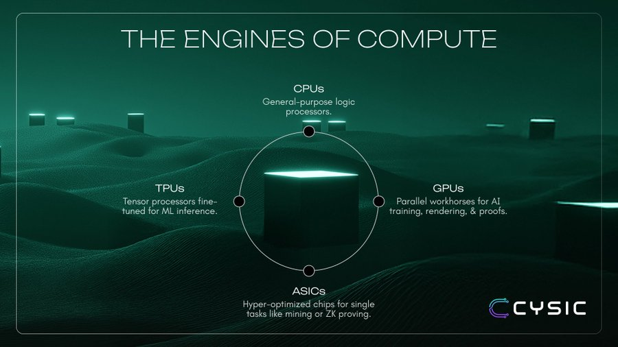 📢 @cysic_xyz just talked about the origins of “compute” starting with silicon. Every chip has its own task, from general-purpose CPUs to AI-accelerating GPUs and ZK proving. There are even ASICs and TPUs, specialized monsters for each task. It sounds simple, but in fact, this is the foundation of the entire digital world. From small laptops to giant AI clusters, all run on silicon. Now I understand why compute is called “the electricity of the intelligent era”.