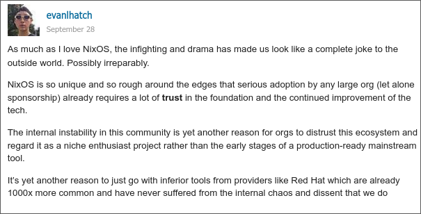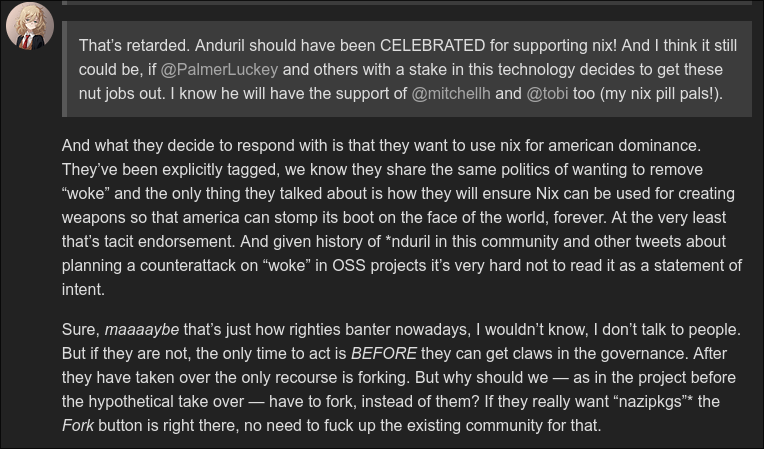 Fun fact: Despite the niche topic, their most popular tweet about the Nix moderation team resignation earned over 60,000 views and more than 800 likes, proving them to be a key source of entertaining updates in the NixOS world.
