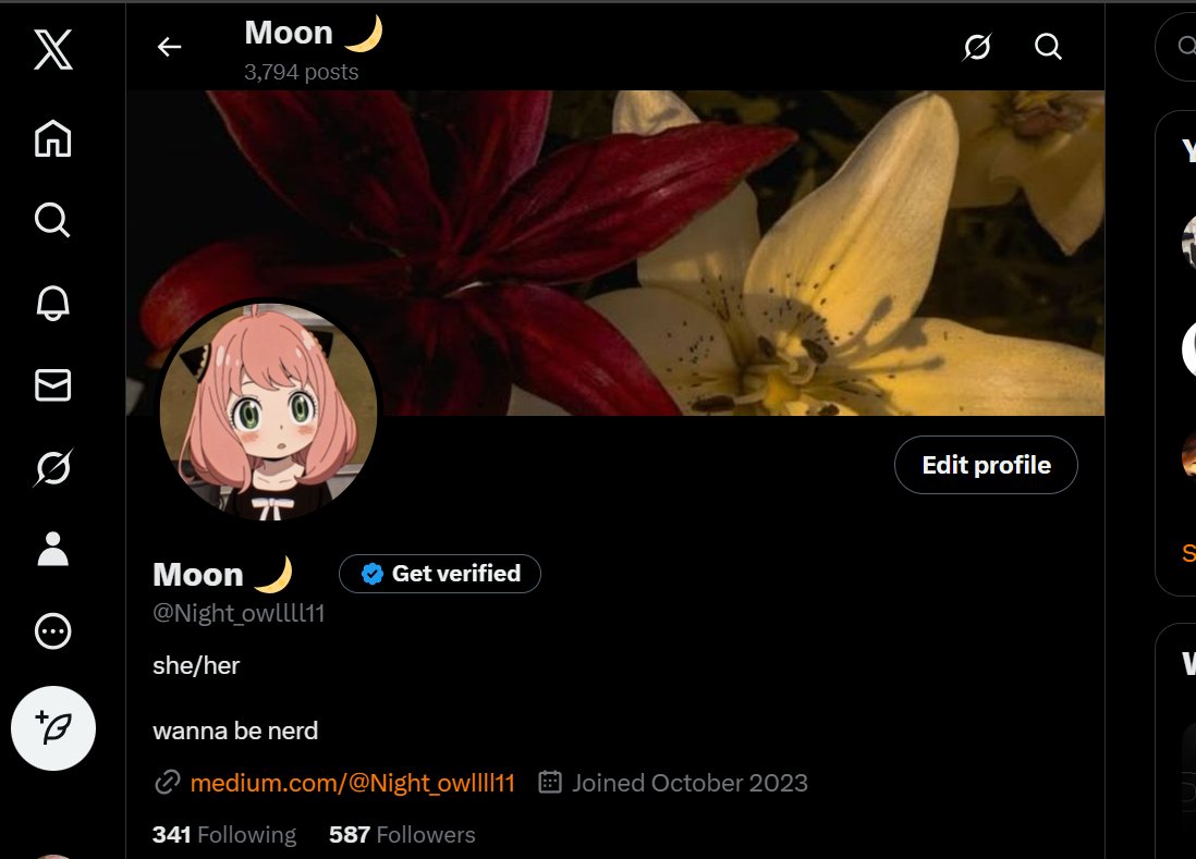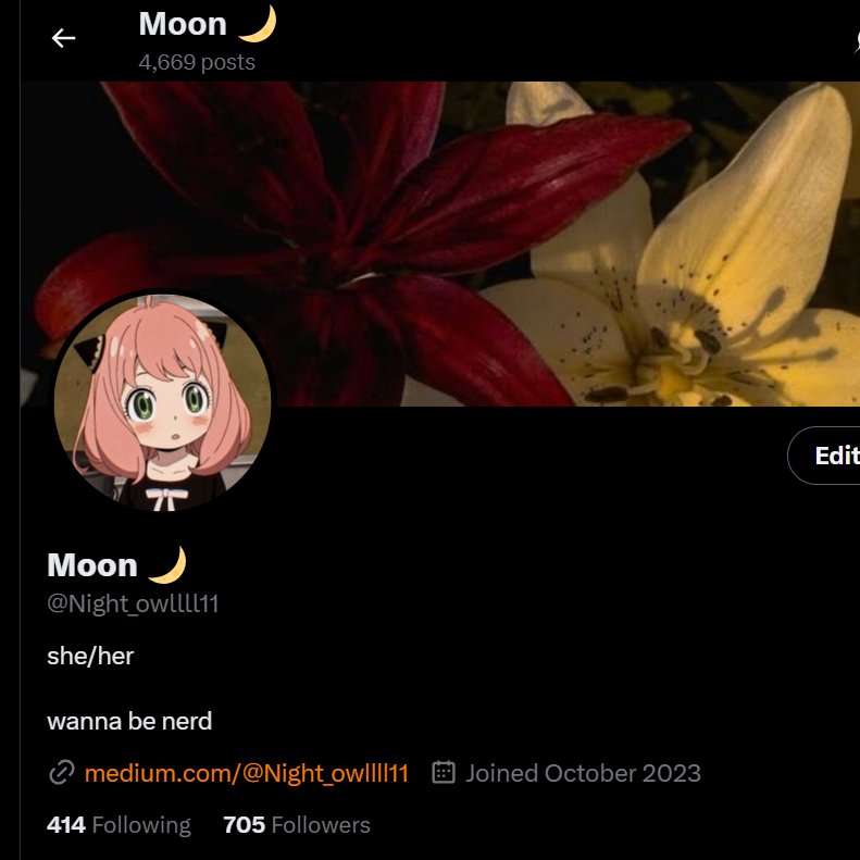 Moon 🌙 is a determined and spirited individual who embraces her 'wanna be nerd' vibe while engaging actively with her community through nearly 5,000 tweets. She openly shares her struggles with focus and motivation, making her relatable and genuine to her followers. Her playful and candid style reflects both a pursuit of growth and a lighthearted approach to life.
