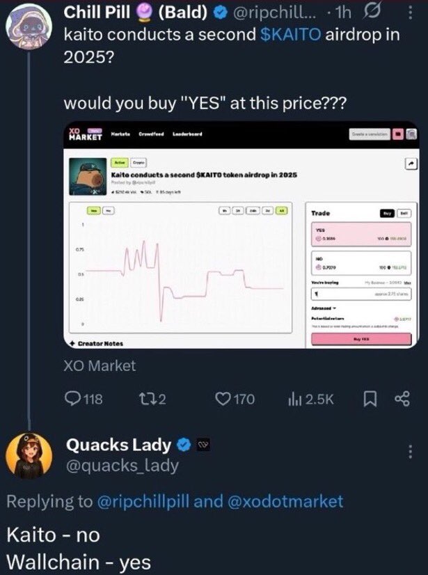 🦆… @quacks_lady 's reply to Kaito airdrop hype: 'Wallchain YES' → 2025 airdrop incoming?