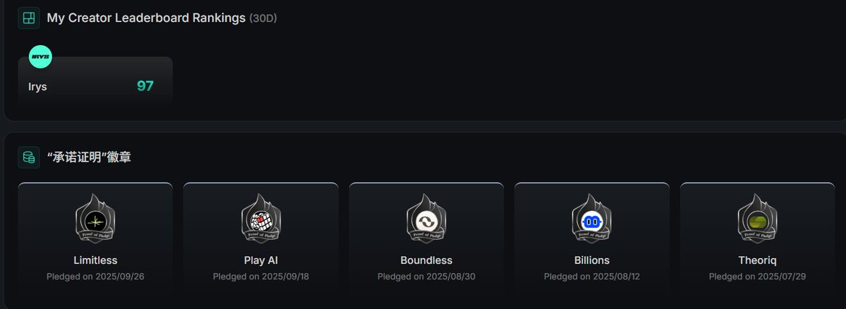 建设Irys与打新之道: 我的build旅程与思考作为深耕build领域的创作者 🔸我始终秉持“只建不聊”的原则,将时间和精力投入到实际行动中,而非沉溺于空洞的嘴撸。 截止到2025年10月29日 我的 @irys_xyz 30D Creator Leaderboard排名达到97 虽然排名还是有点拉胯 但至少凭借对项目的理解和build上榜了!些许欣慰! 还记得年初 @yueya_eth 叫我做推特的时候还一窍不通! 🔸经过一年的学习沉淀解锁了 @trylimitless (2025/09/26) @playAInetwork (2025/09/18) @boundless_xyz (2025/08/30) @billions_ntwk (2025/08/12) @TheoriqAI (2025/07/29) 五枚“Proof of Pledge”徽章 这些成果不仅是 我对 @KaitoAI 得认可! 更是我专注于build和积极打新的见证! 🔸而建设 @irys_xyz 正是我目前的核心驱动力。 对Irys项目的理解让我选择建设Irys,是因为它代表了Web3时代去中心化存储与数据主权的突破性尝试。 不仅如此也认识了很多韩国小伙伴一起建设! 在当前数字世界,数据垄断和隐私泄露已成为常态,传统云服务往往将用户置于被动地位。 Irys通过其分布式存储网络和经济激励机制,赋予用户对数据的主控权,这与我的技术信念高度契合。 我认为,Irys不仅仅是一个技术项目,更是一种哲学——通过去中心化技术重塑人与数据的关系。 🔸我一直记得中国行的时候 @josh_benaron “Irys 让数据从静态变动态,AI 开发者梦寐以求!” 这让我深刻认识到,Irys的潜力不仅在于技术架构,还在于其社区驱动的生态。每一个节点的上线、每一笔数据的上链,都是对中心化体系的挑战。 在xAI的生态中,Irys的角色可能不仅仅是存储基础设施,还可能是AI数据处理的基石,这让我更加坚定了建设它的决心。 @cn_irys_xyz 让我们一起期待 Q4的表现!