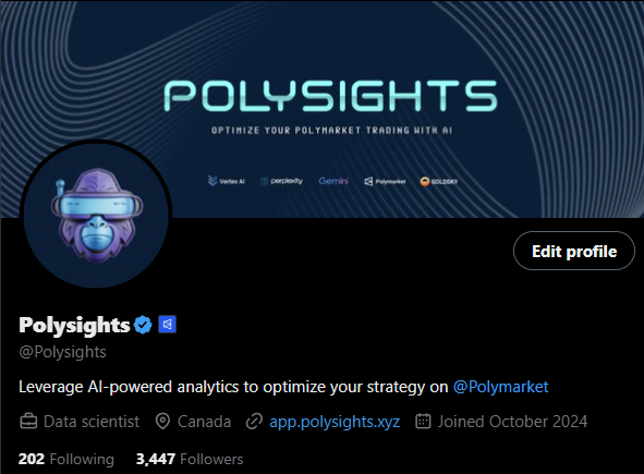 Get live statistics and analysis of Polysights 's profile on X / Twitter Polysights @Polysights Leverage AI-powered analytics to optimize your strategy on @Polymarket