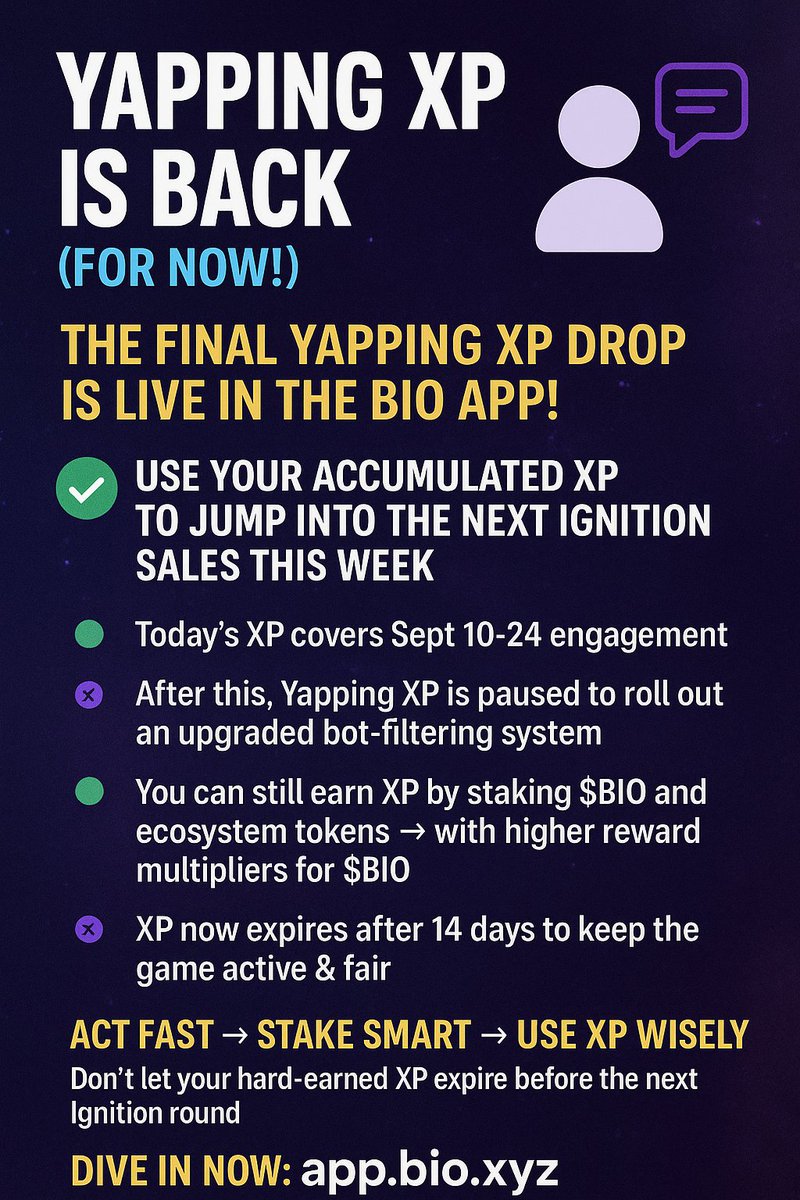 🔮 The final Yapping XP drop is LIVE in the Bio App!