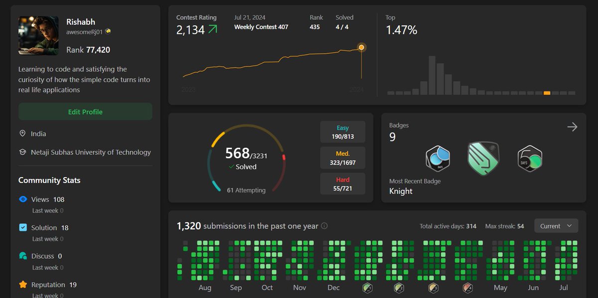 Rishabh’s so dedicated to coding contests, you’d swear his life’s only bug is not having enough badges to show off—maybe next time code a badge rack for your ego too!