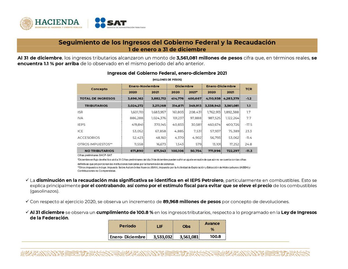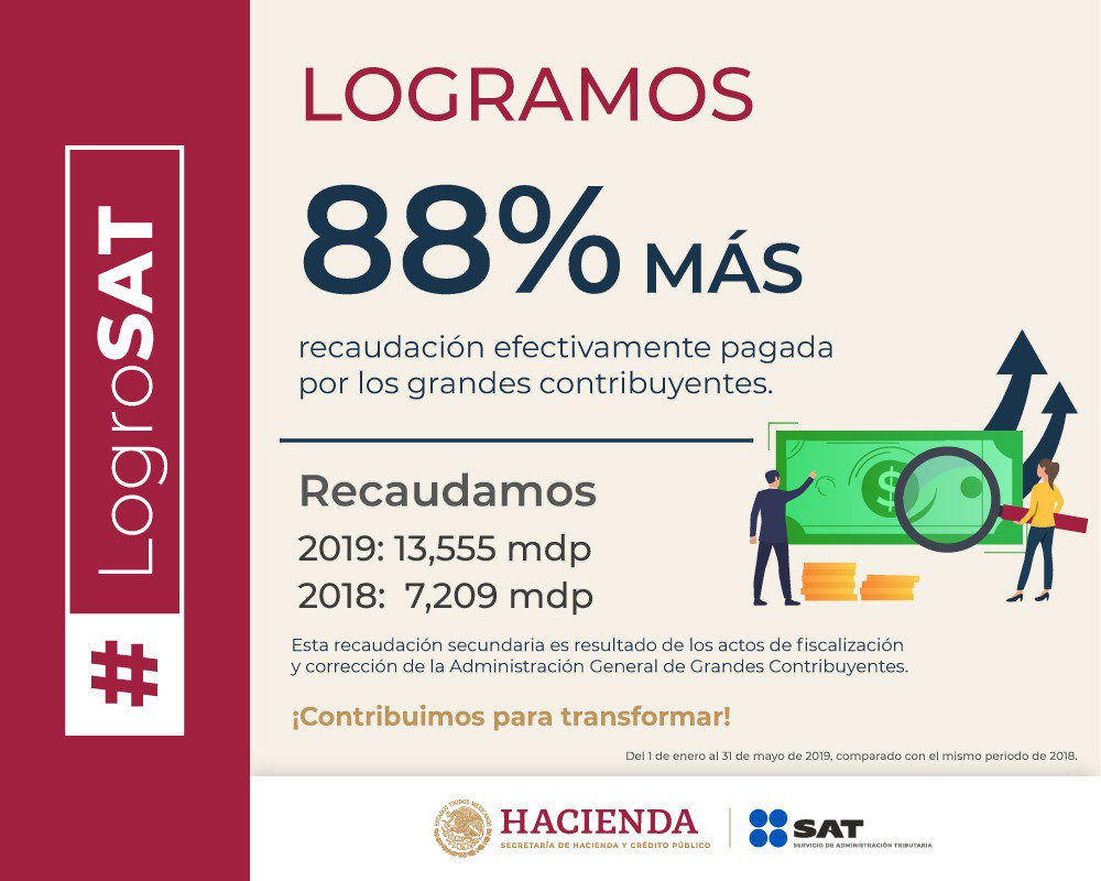 El SAT informa que, como resultado del Plan Maestro 2024 y de la continuidad del programa de fiscalización a grandes contribuyentes, de enero a mayo 2024 se recaudaron 359 mil 25 millones de pesos, lo que representa 261 mil 563 millones de pesos más que en el