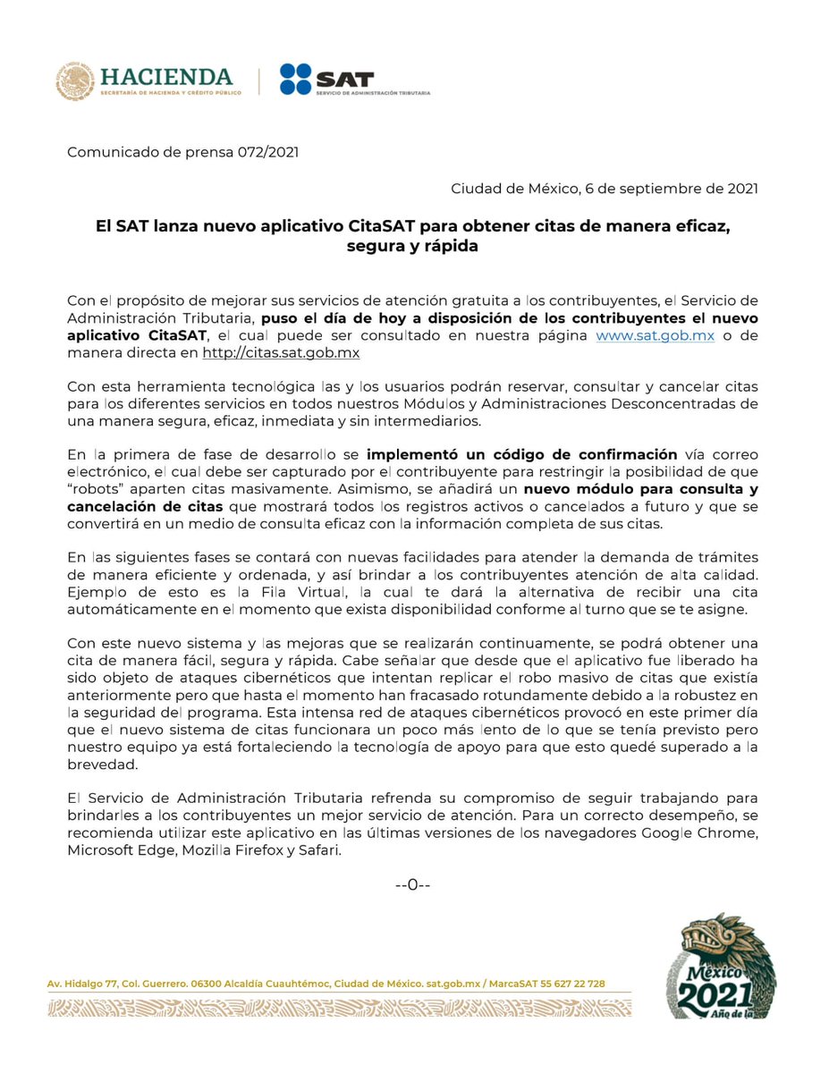 Con el objetivo de mejorar nuestros servicios, el SAT lanza el nuevo aplicativo #CitaSAT para que los contribuyentes reserven, consulten y cancelen citas de manera inmediata y segura. Ingresa a citas.sat.gob.mx ¡y agenda!