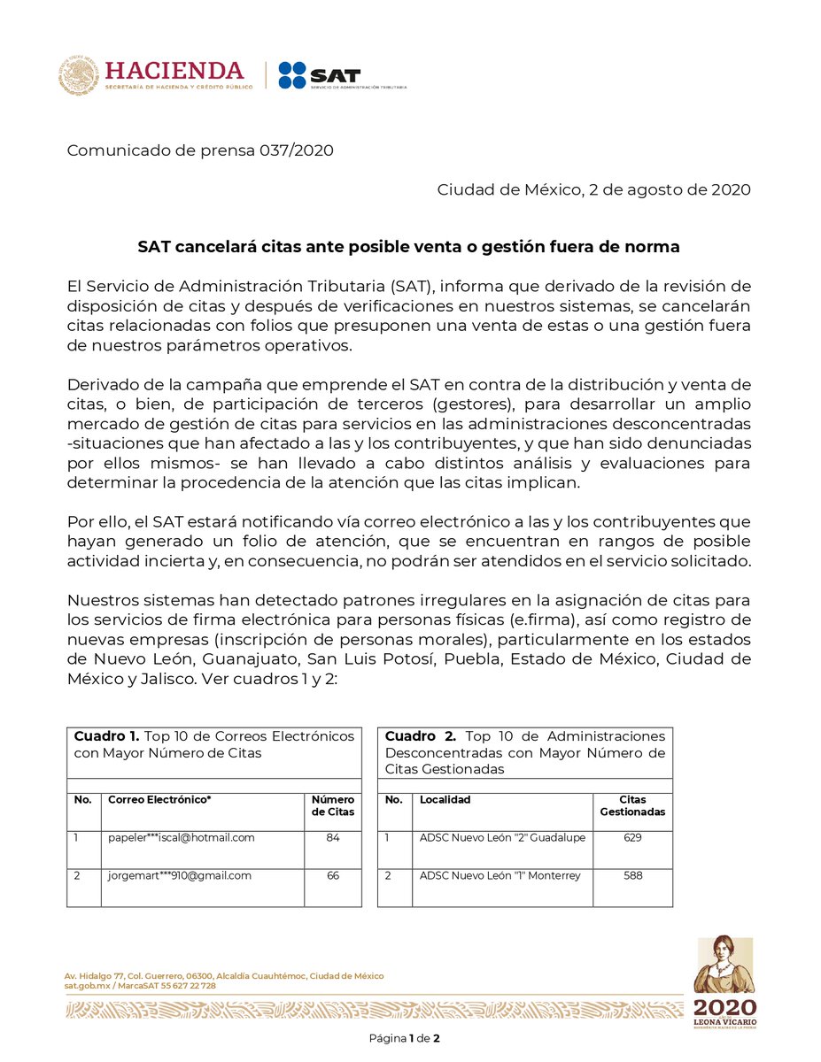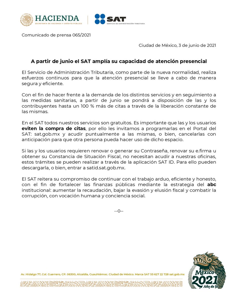 A partir de junio el SAT liberará un mayor número de citas para atender de manera segura y eficiente a las y los usuarios. Entra a sat.gob.mx para programarla. Nuestros servicios son gratuitos, evita la compra de citas.