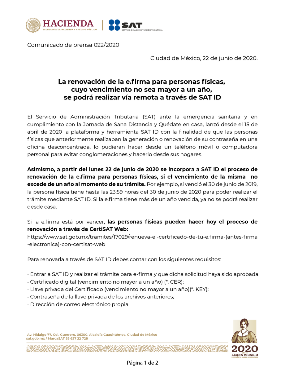 La renovación de la e.firma, cuyo vencimiento no sea mayor a un año, se podrá realizar vía remota a través de SAT ID.