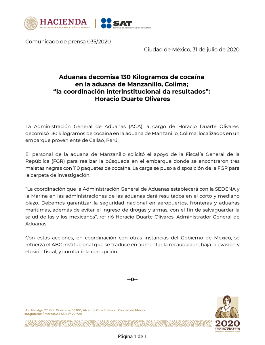 Aduanas decomisa 130 Kilogramos de cocaína en la aduana de Manzanillo, Colima; “la coordinación interinstitucional da resultados”: Horacio Duarte Olivares.